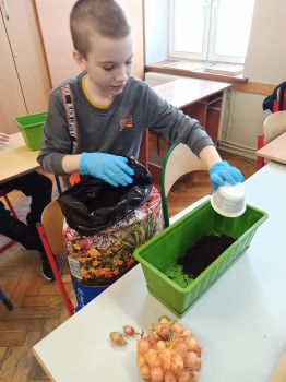 „ Sadzimy cebule”- uczniowie rozwijają umiejętności związane z poznawaniem świata roślin, sypią ziemię do przygotowanego pojemnika i sadzą sadzonki cebuli, następnie podlewają i ustawiają na parapecie.