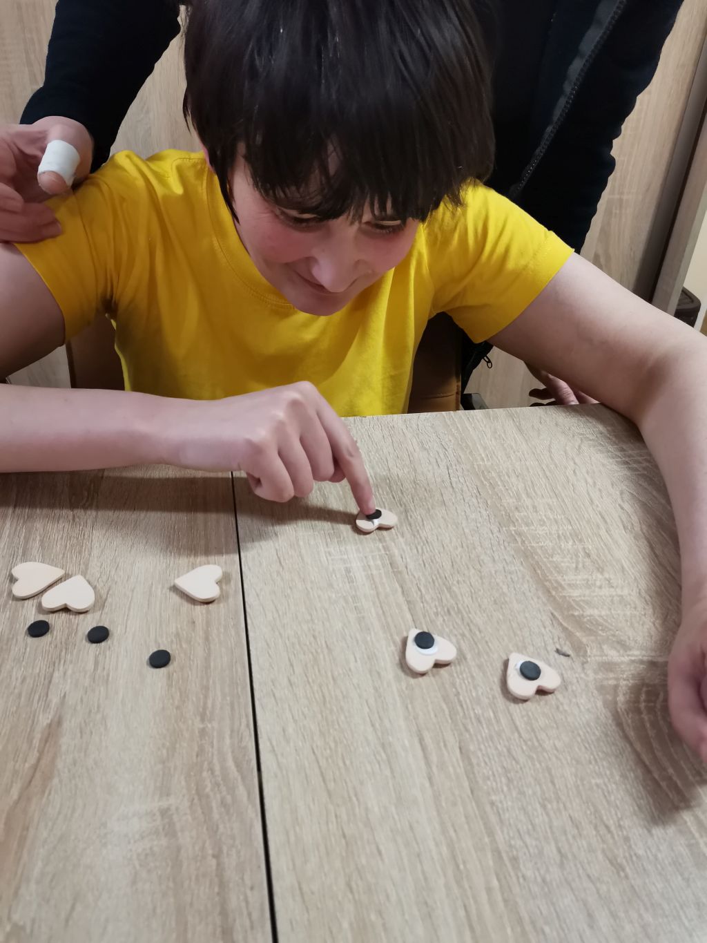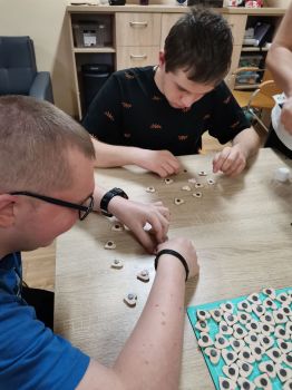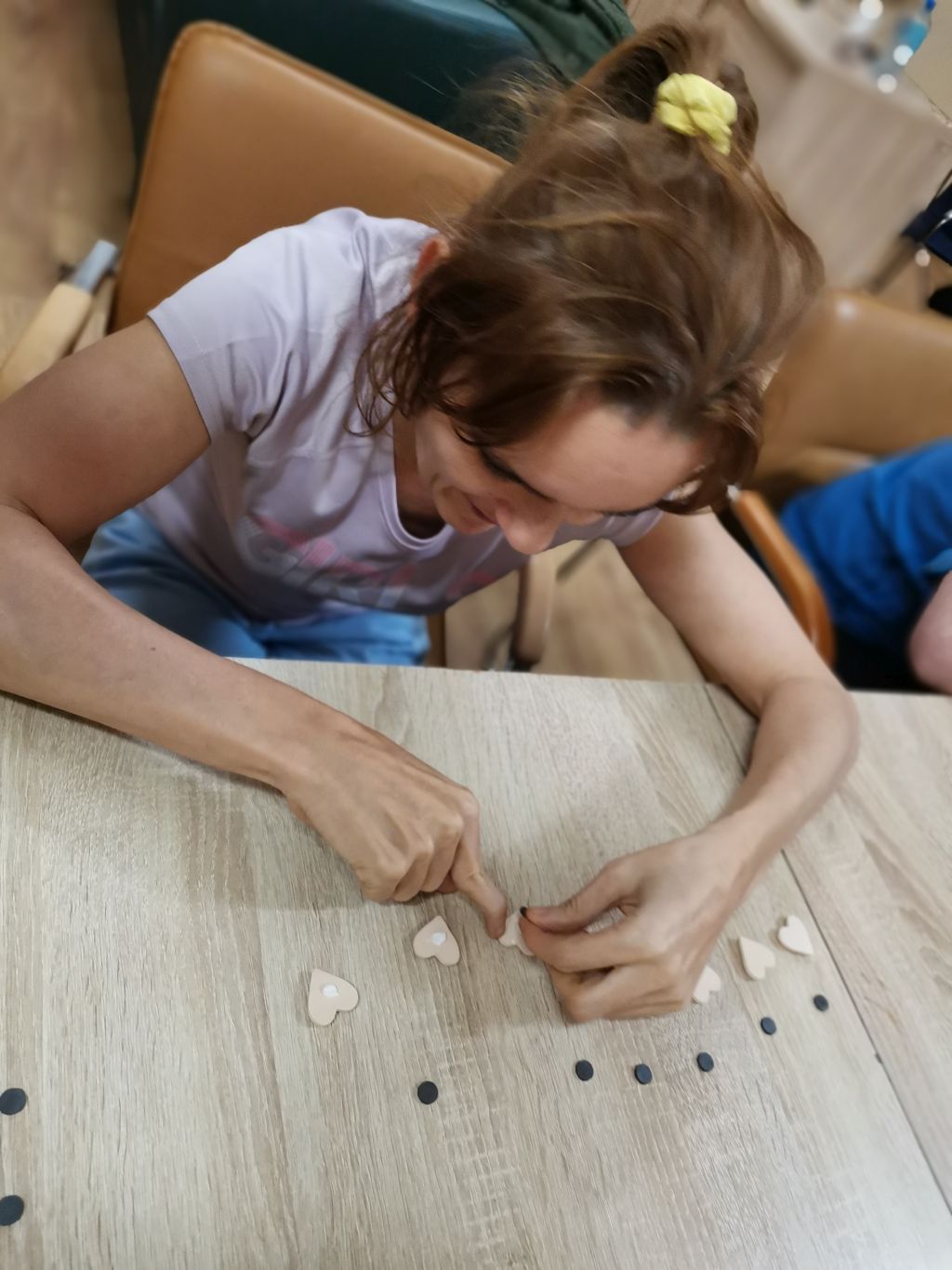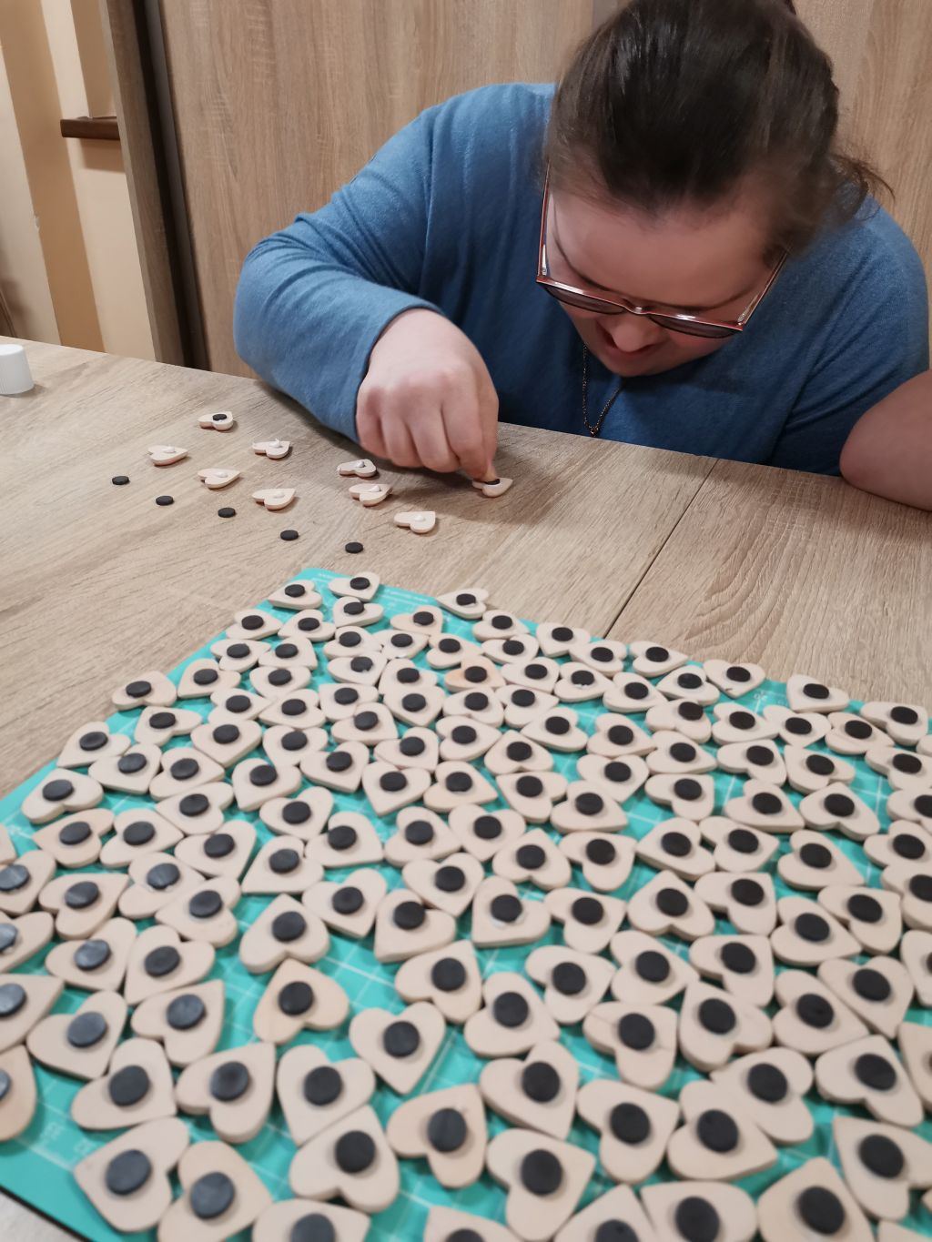 W ramach treningu kształtującego kreatywność uczestnicy Mieszkań Treningowych drukowali i wycinali ulotki z 1,5% oraz przyklejali magnesy do ceramicznych serduszek.