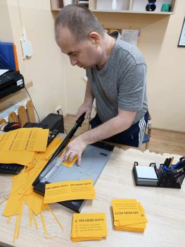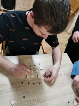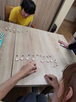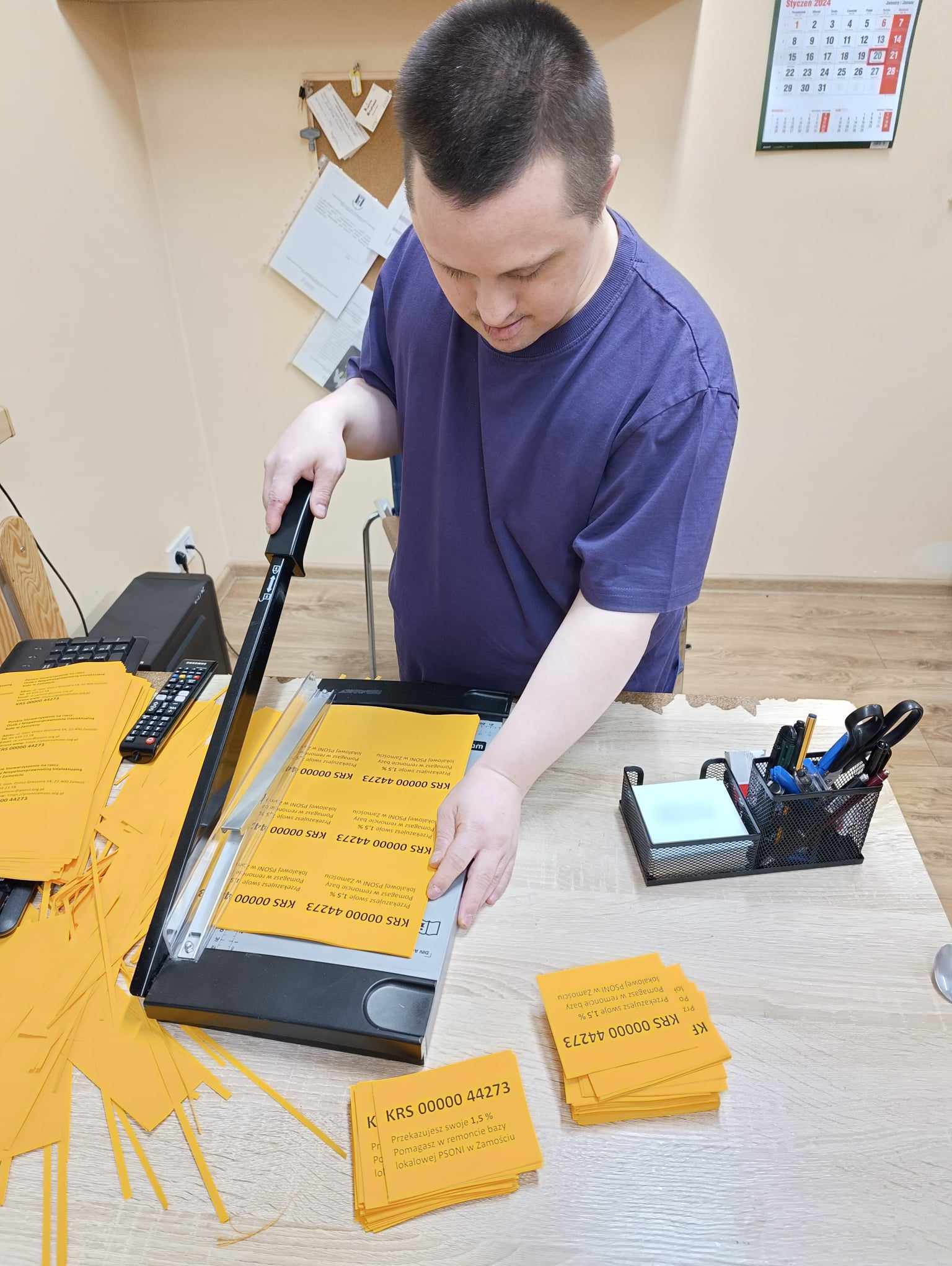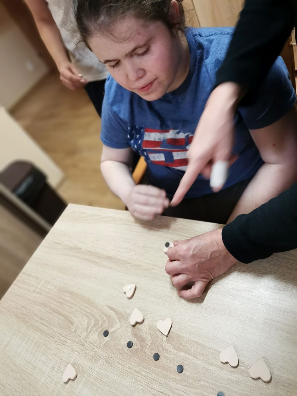 W ramach treningu kształtującego kreatywność uczestnicy Mieszkań Treningowych drukowali i wycinali ulotki z 1,5% oraz przyklejali magnesy do ceramicznych serduszek.