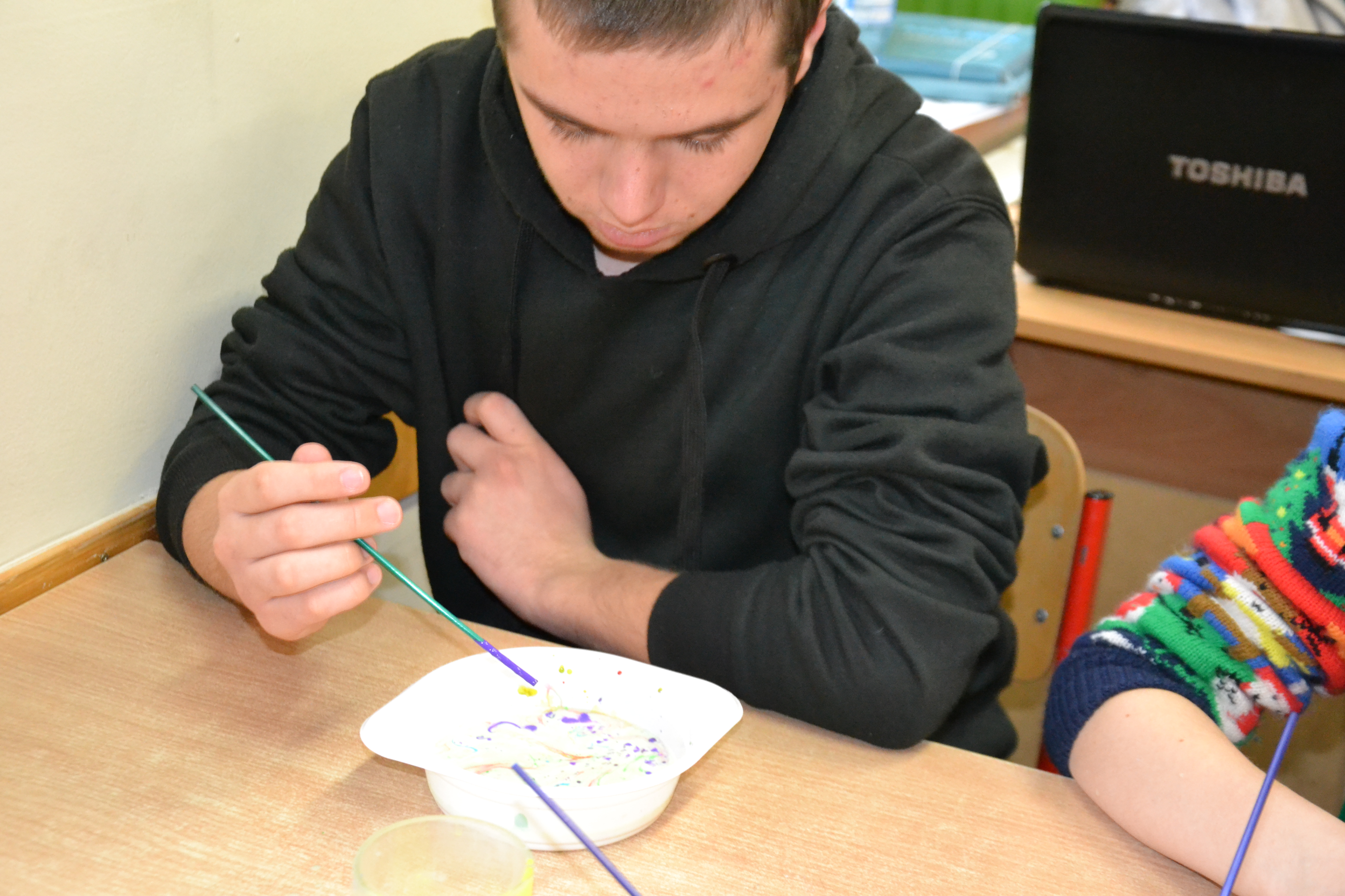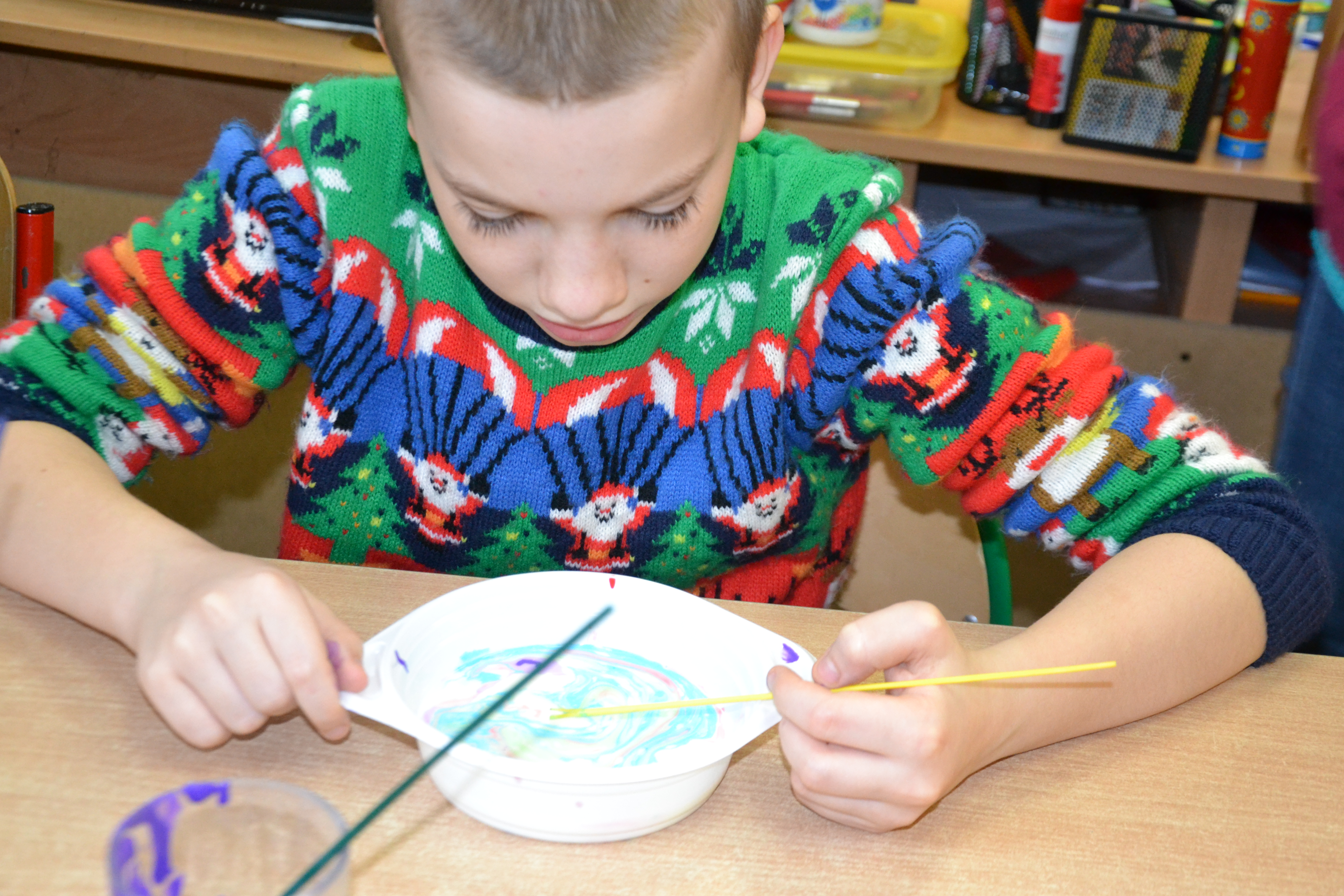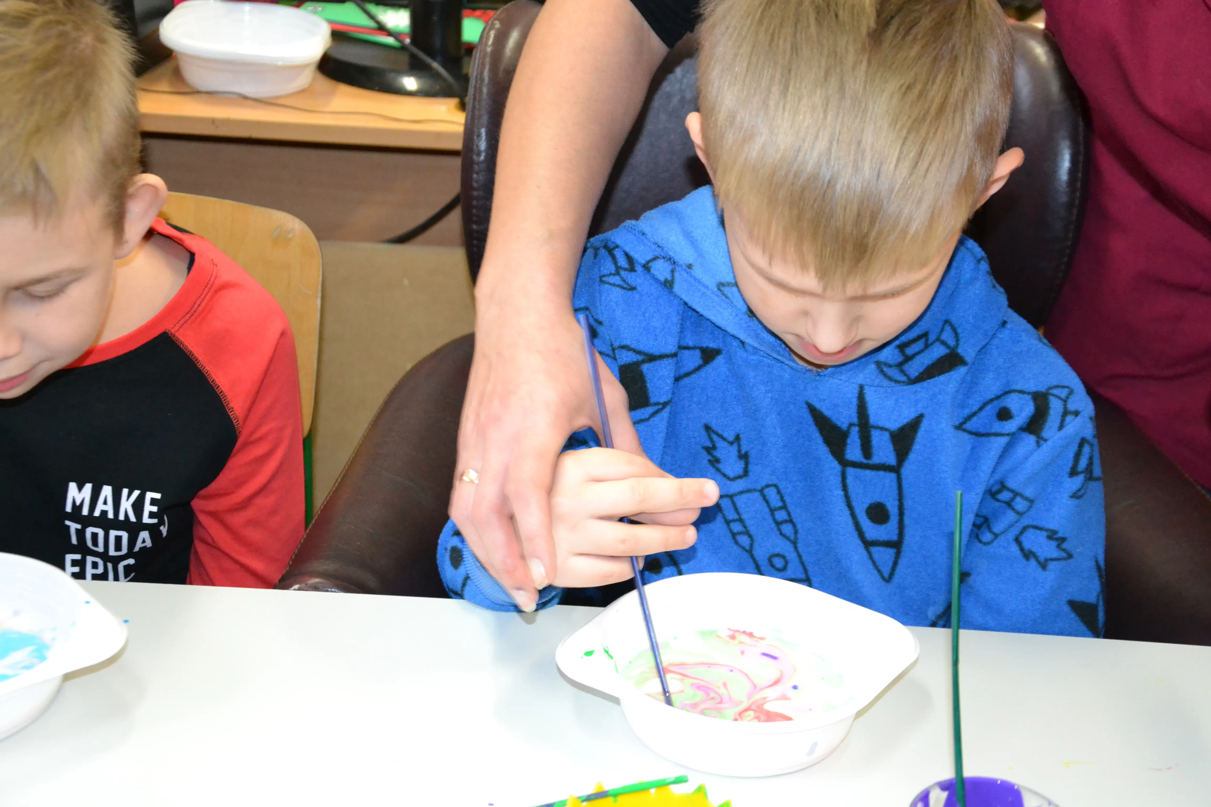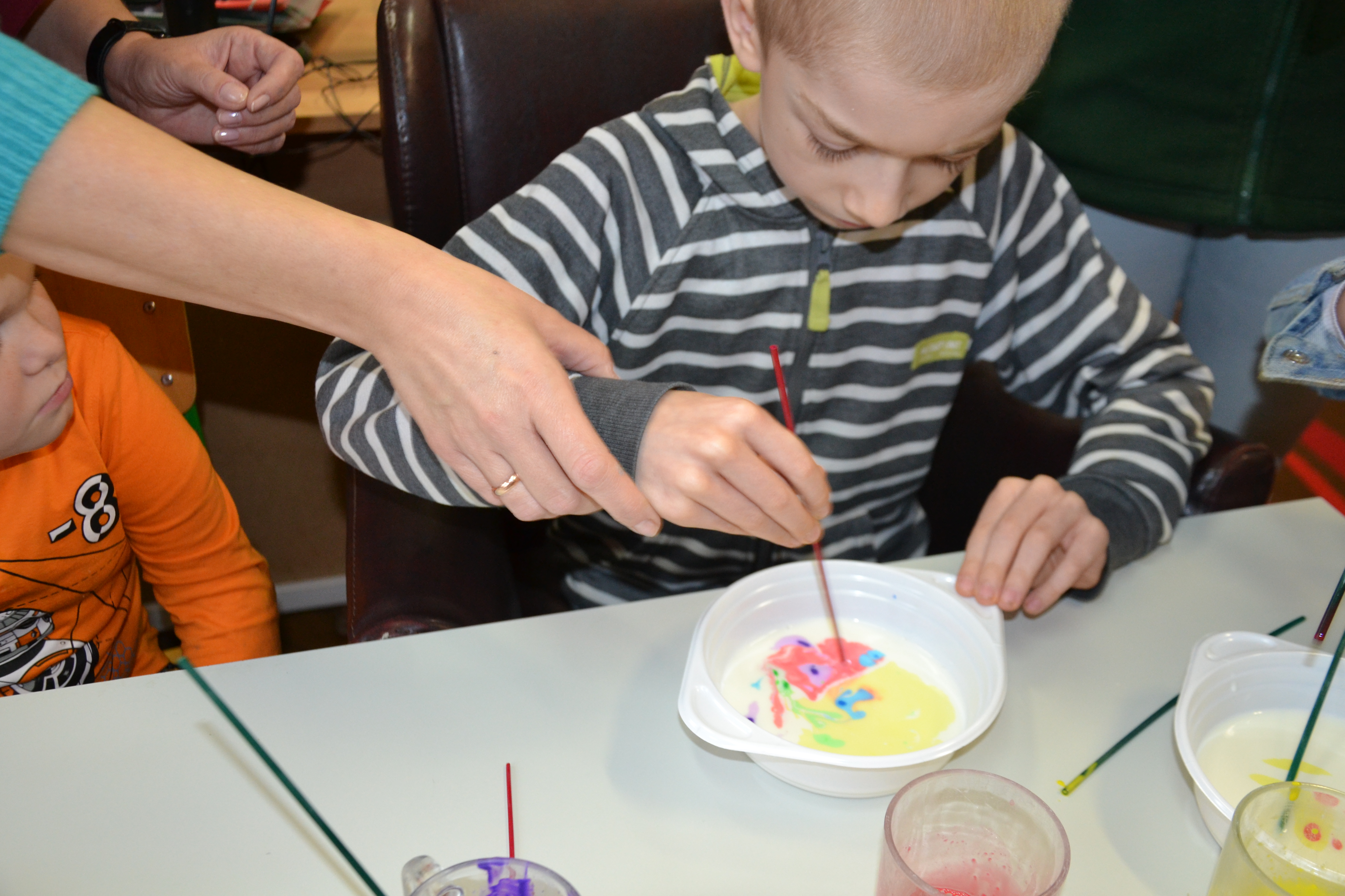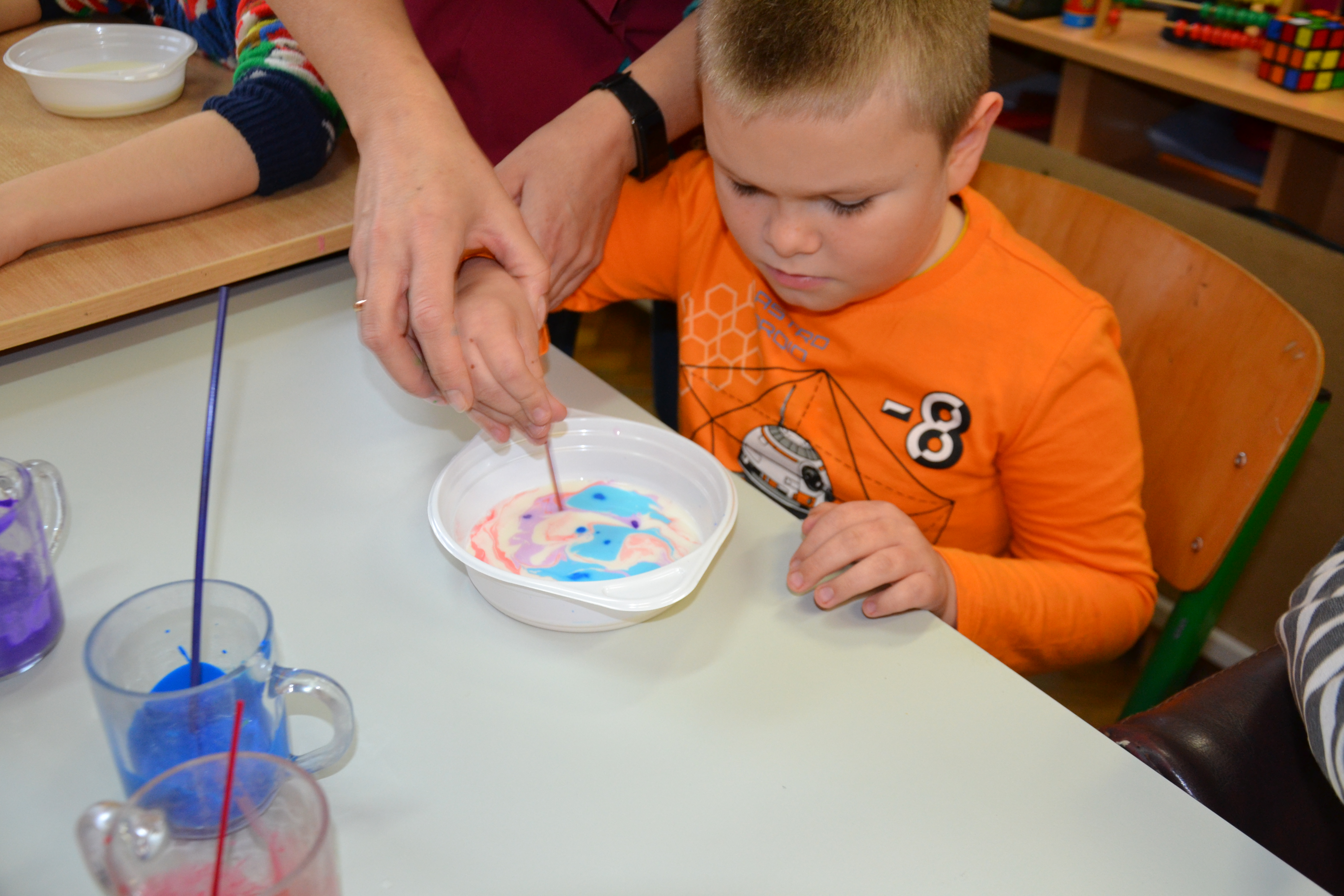 Dzieci z grup przedszkolnych edukacyjnych i rewalidacyjnych w ramach projektu wykonały Obraz Malowany Na Mleku.