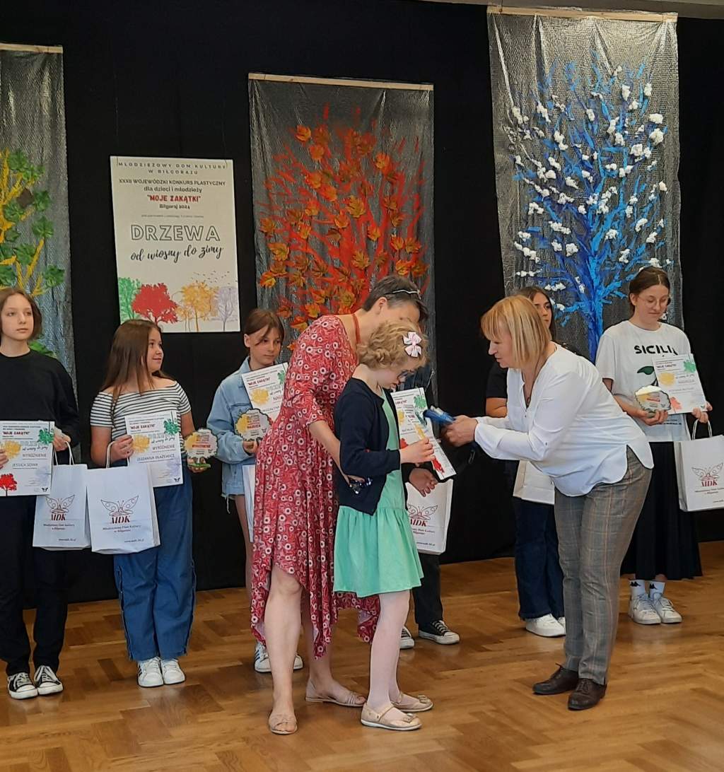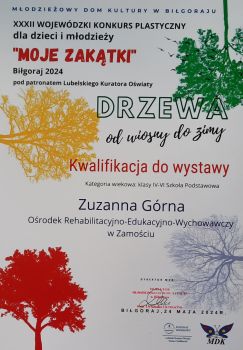 W piątek, 24 maja uczennica Zuzanna Górna i nauczyciel odpowiedzialny za wykonanie pracy Agnieszka Oberda uczestniczyły w podsumowanie XXXII Wojewódzkiego Konkursu Plastycznego dla Dzieci i Młodzieży „Moje Zakątki” pod patronatem Lubelskiego Kuratora Oświaty, który odbył się w Młodzieżowym Domu Kultury w Biłgoraju.