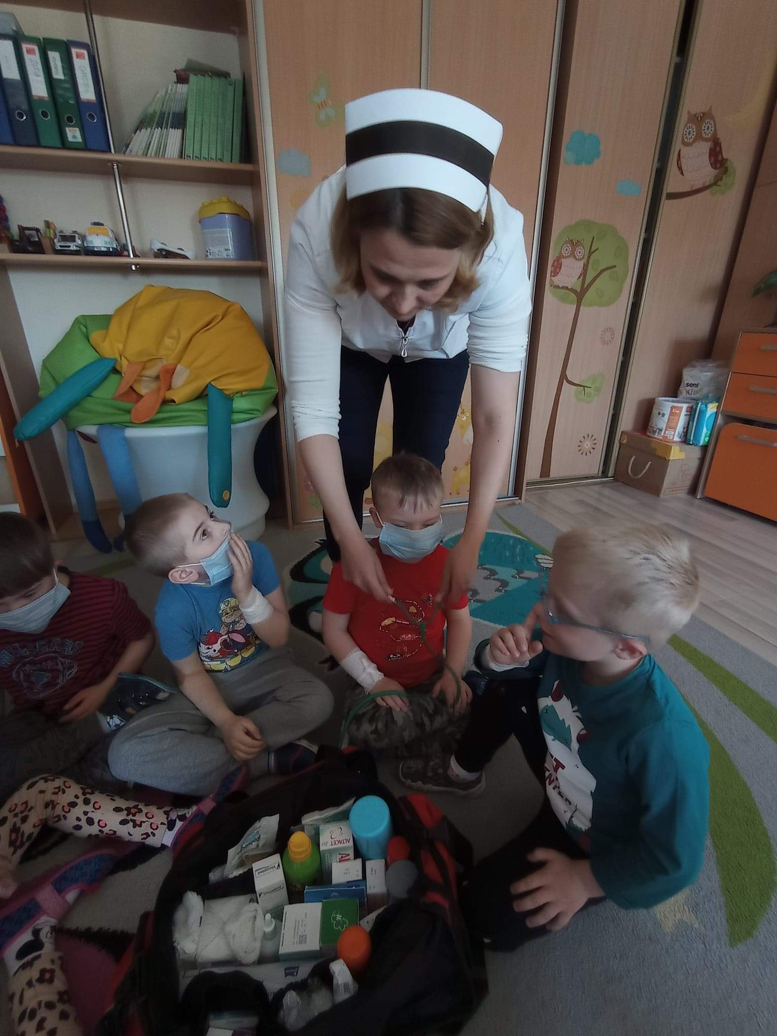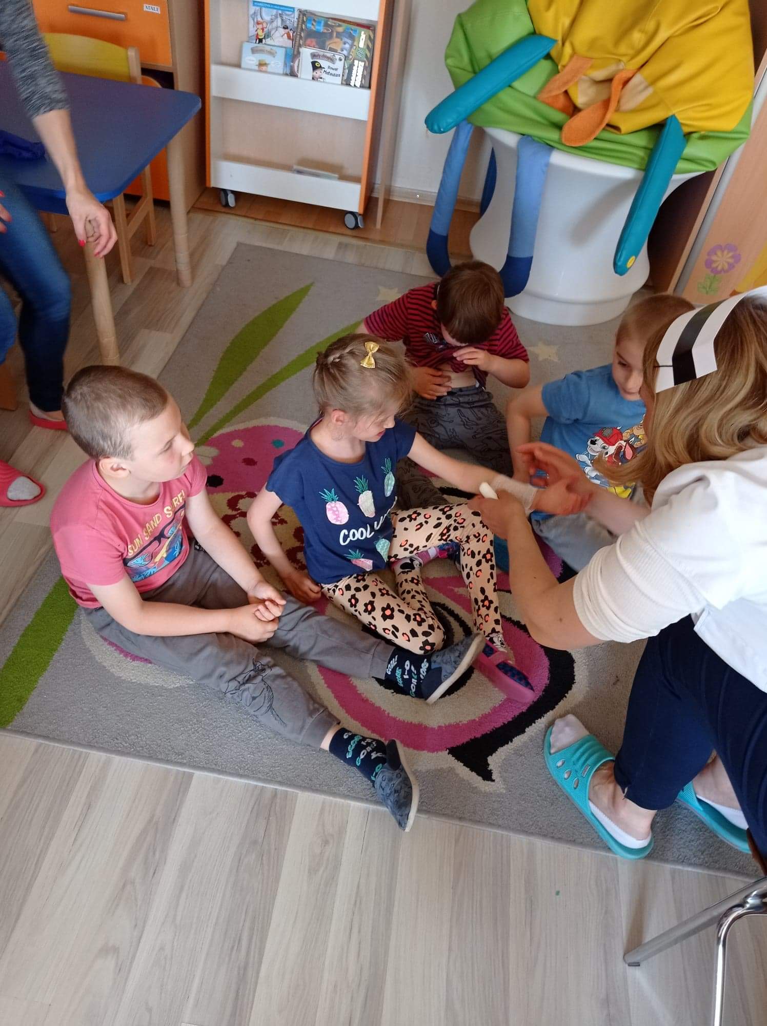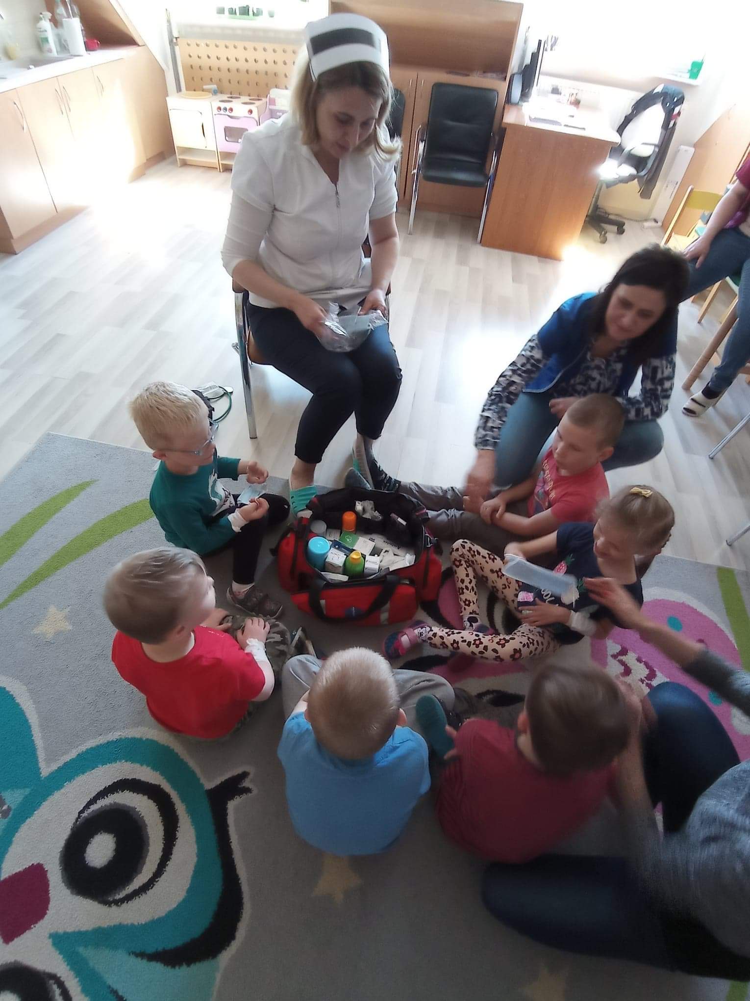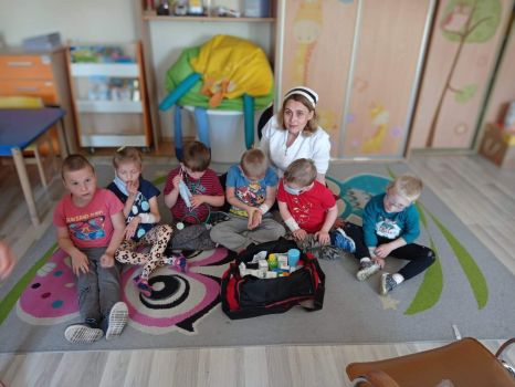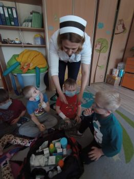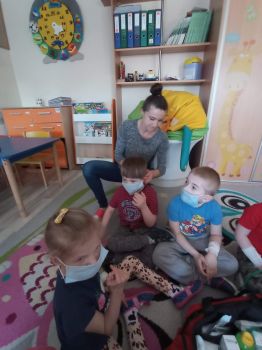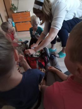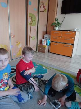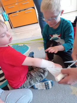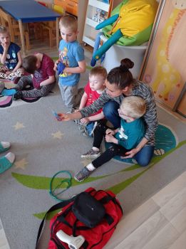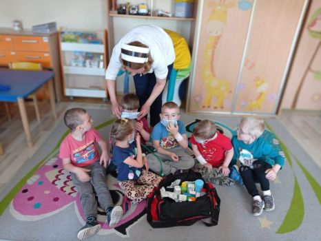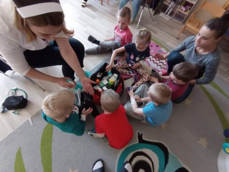 Na zajęciach dzieci poznawały zawód pielegniarki. Uczyły się badać funkcje życiowe, mierzyć ciśnienie, temperaturę oraz bandażować rany. Zapoznały się z zawartością torby pierwszej pomocy.