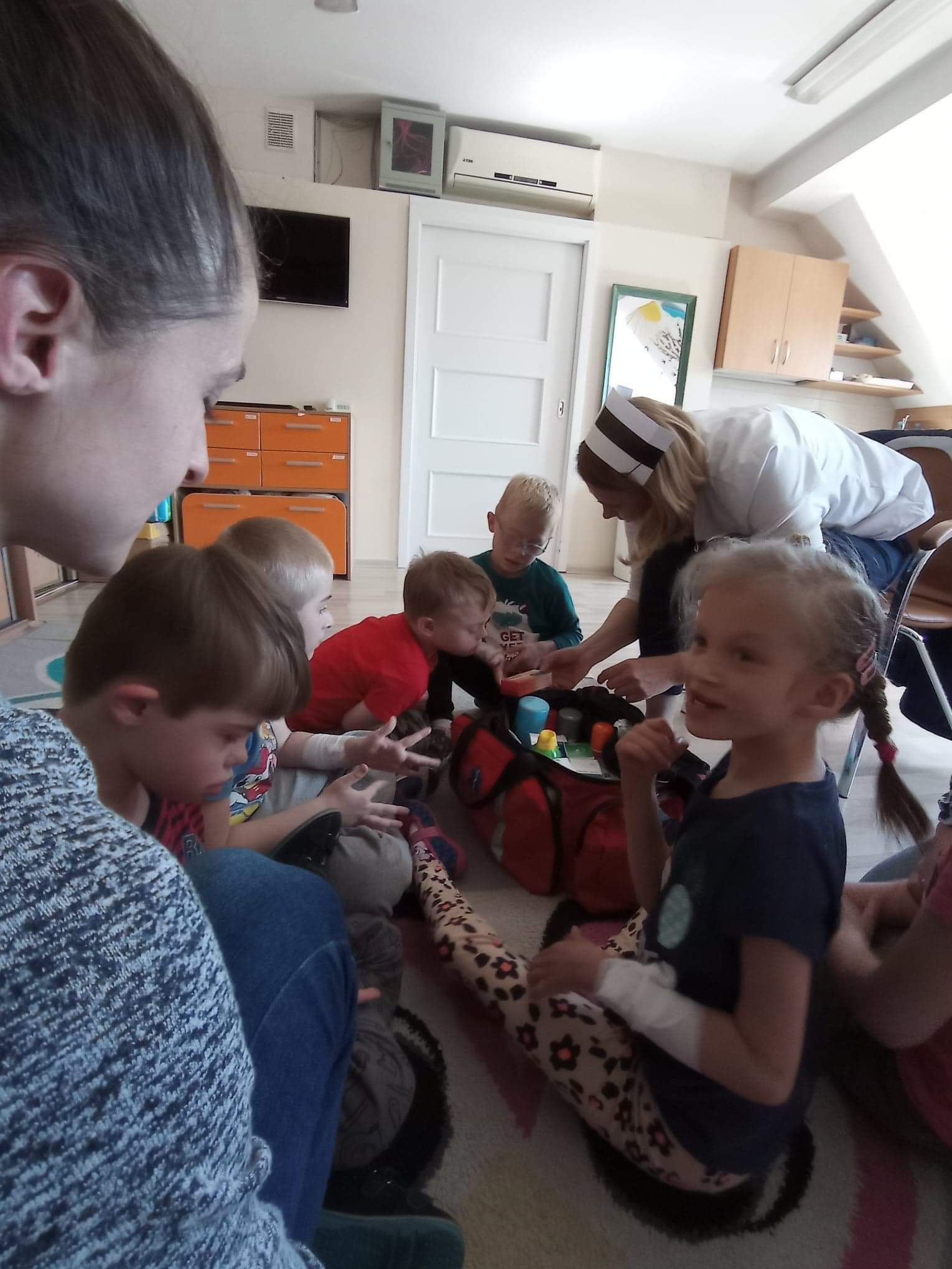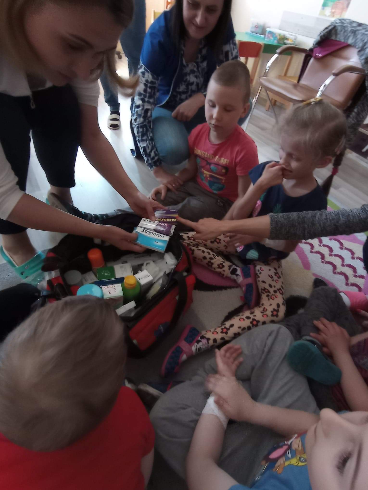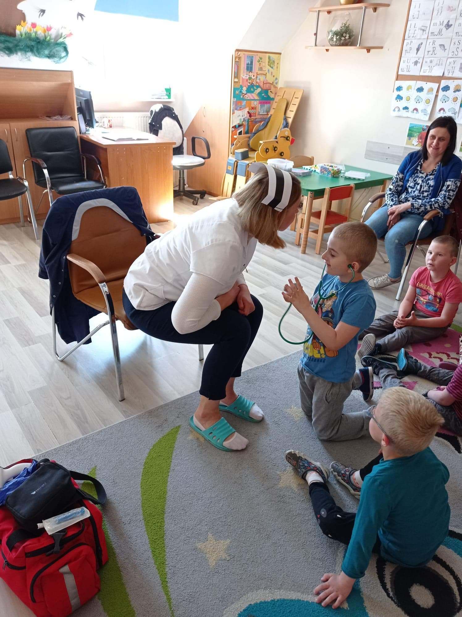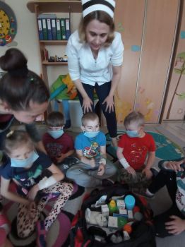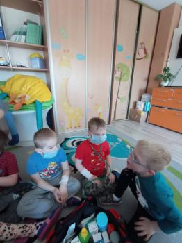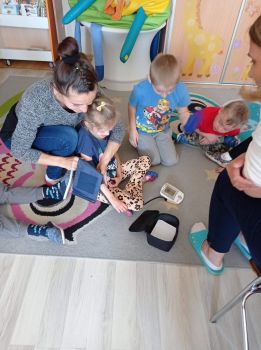 Na zajęciach dzieci poznawały zawód pielegniarki. Uczyły się badać funkcje życiowe, mierzyć ciśnienie, temperaturę oraz bandażować rany. Zapoznały się z zawartością torby pierwszej pomocy.