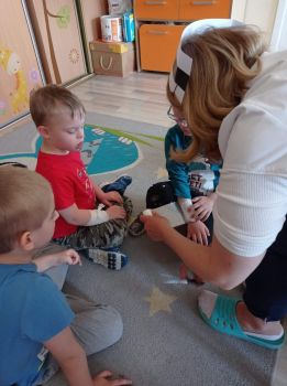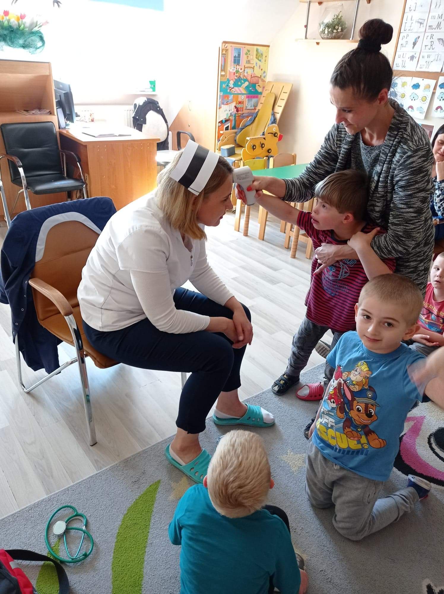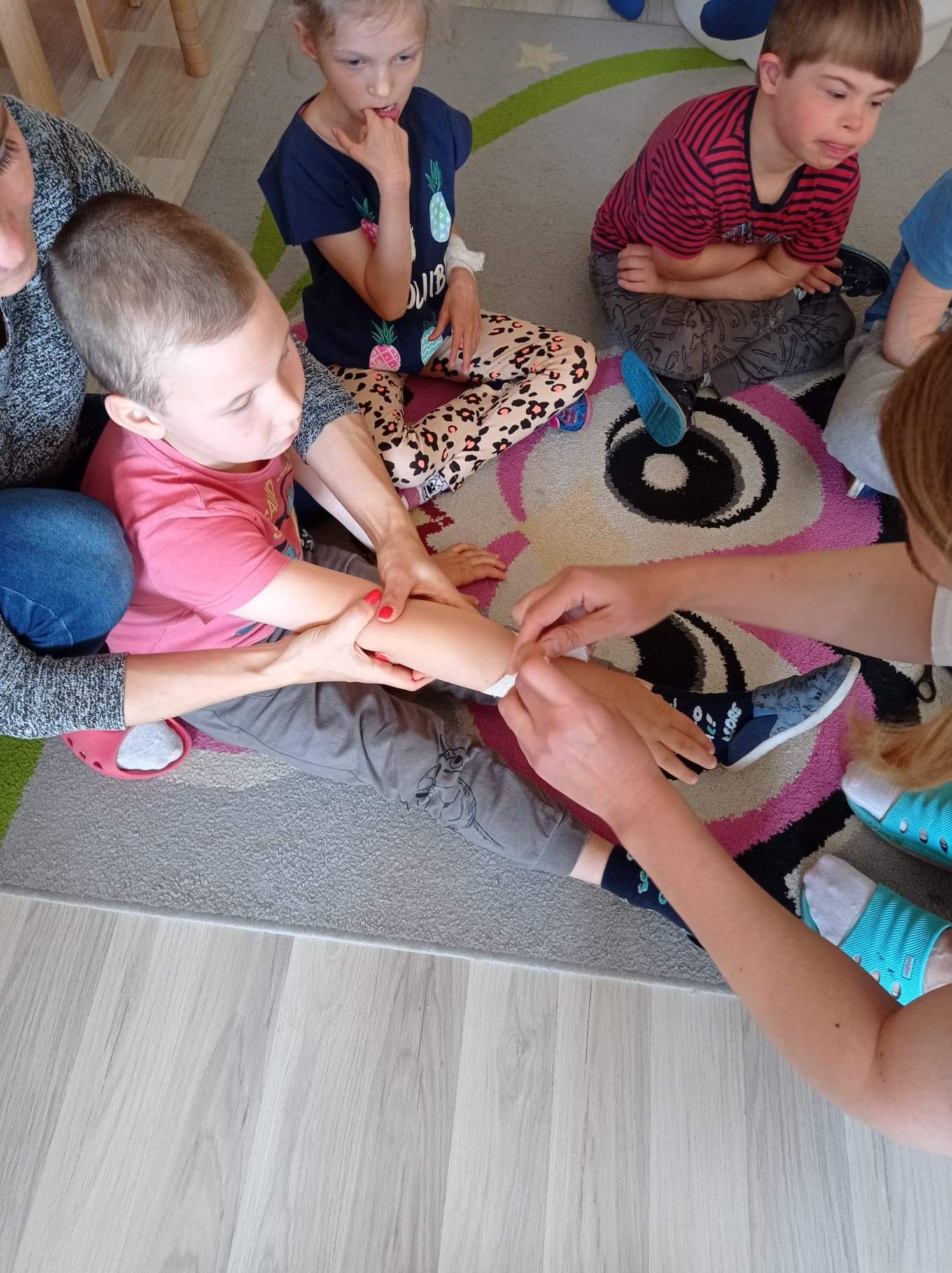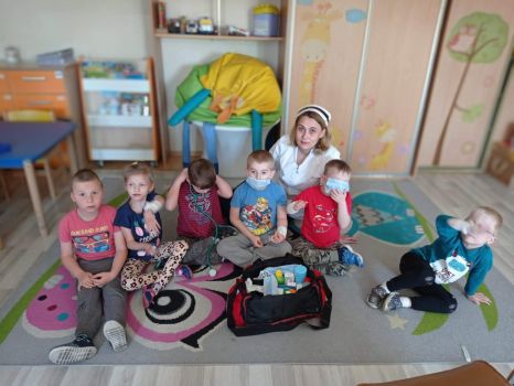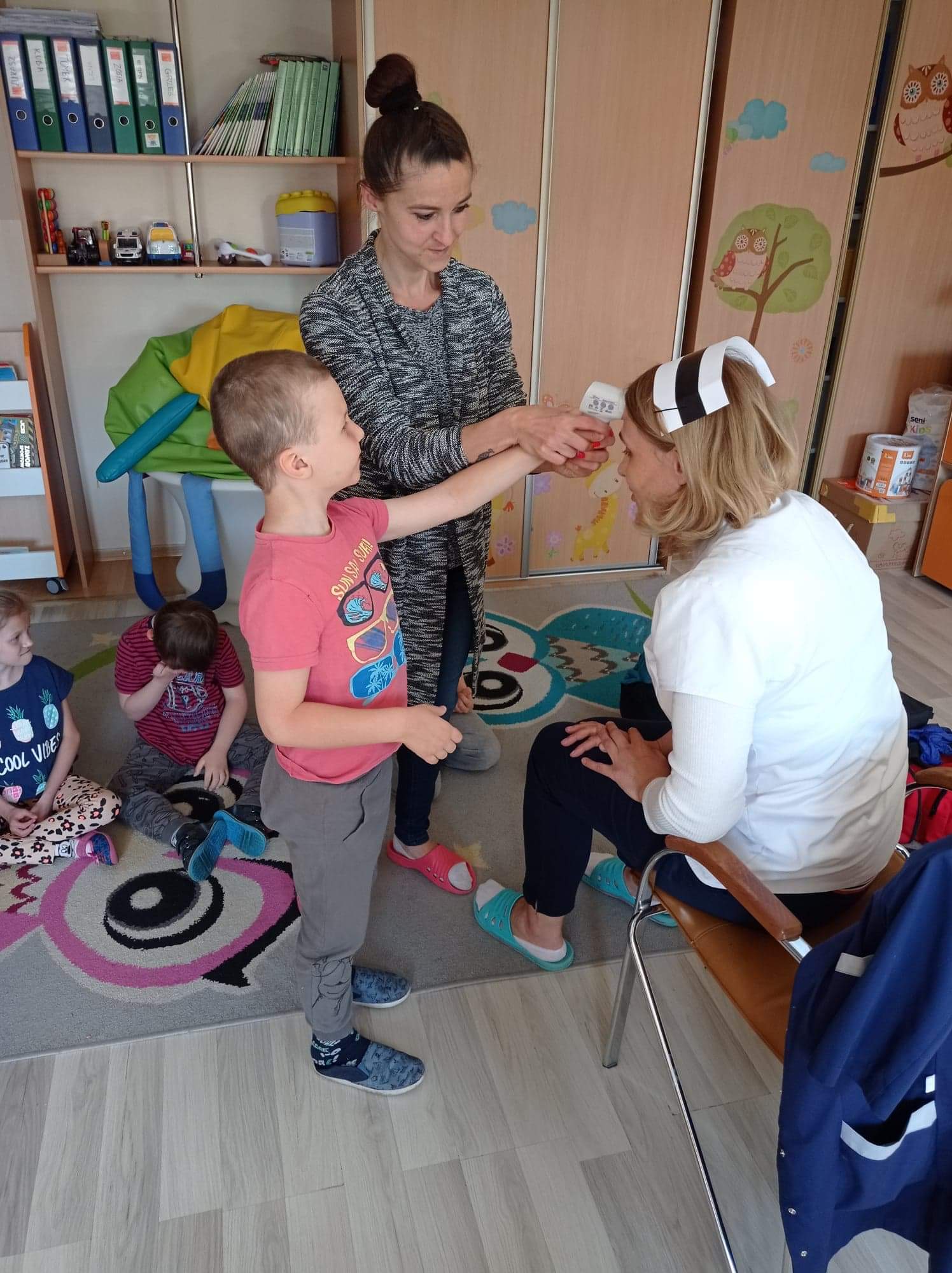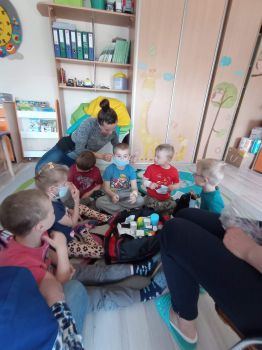 Na zajęciach dzieci poznawały zawód pielegniarki. Uczyły się badać funkcje życiowe, mierzyć ciśnienie, temperaturę oraz bandażować rany. Zapoznały się z zawartością torby pierwszej pomocy.