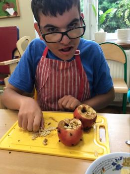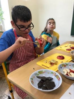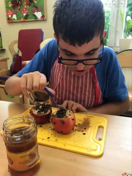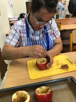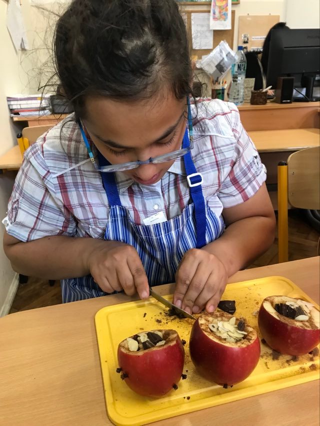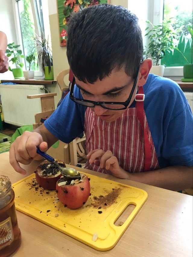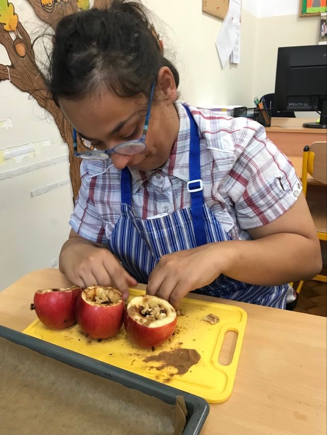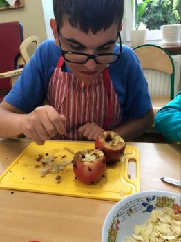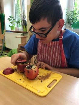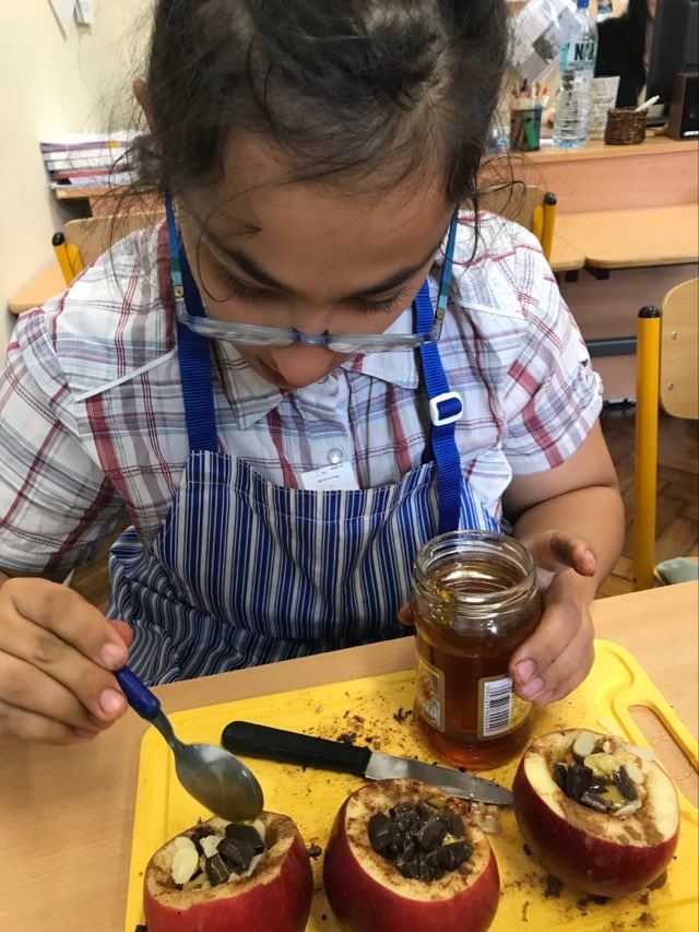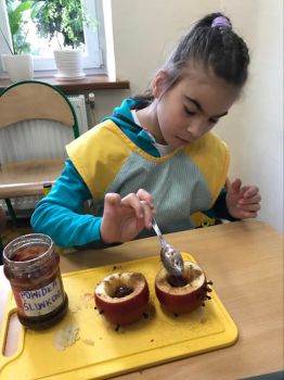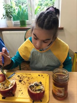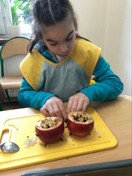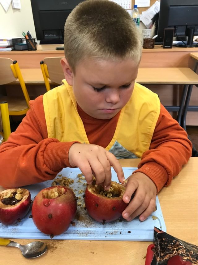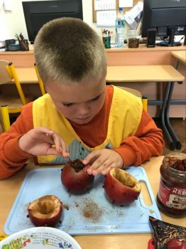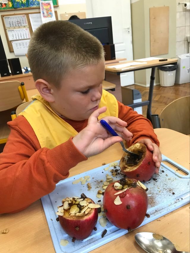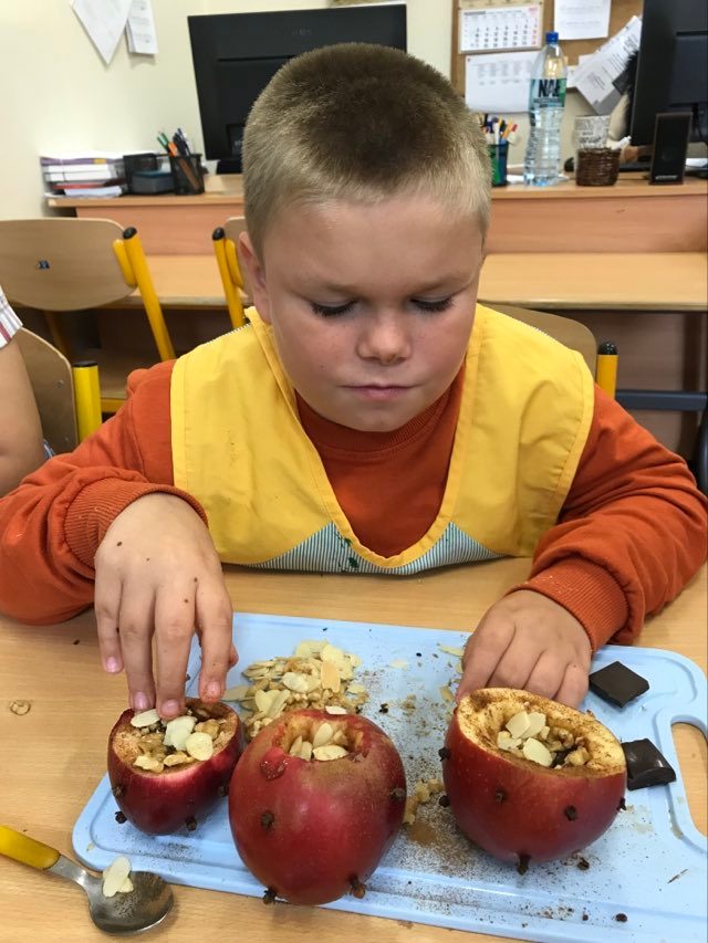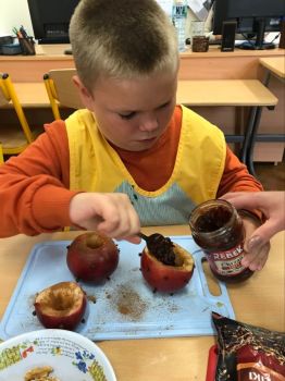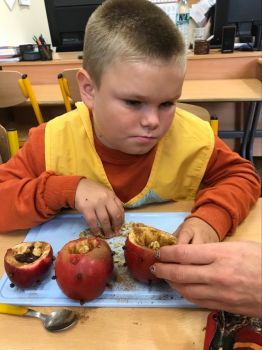 16 września 2022 r. uczniowie klas edukacyjnych przygotowali przepyszny, zdrowy deser "Jabłka pieczone z cynamonem" w ramach projektu "4 pory roku na talerzu".
