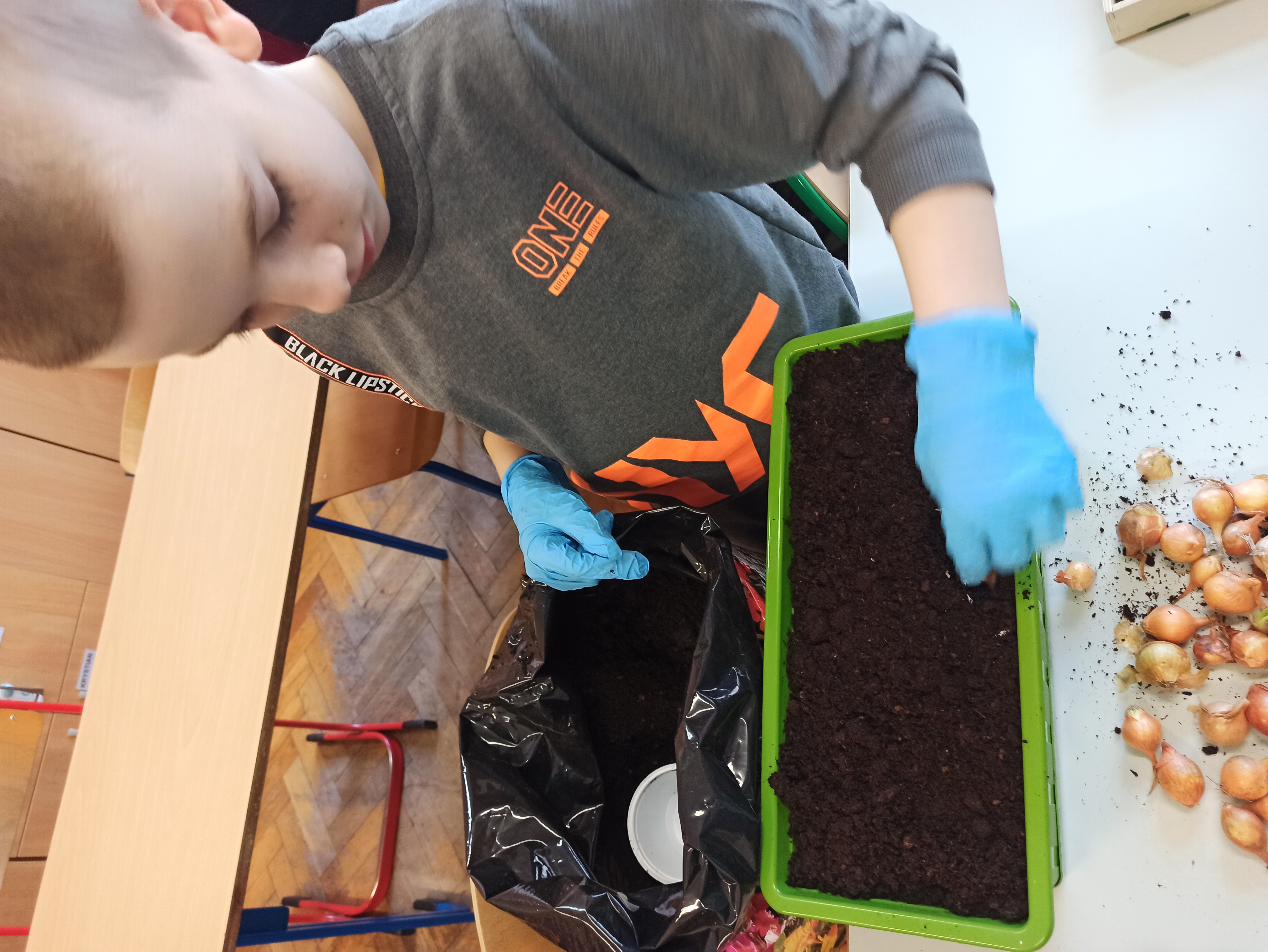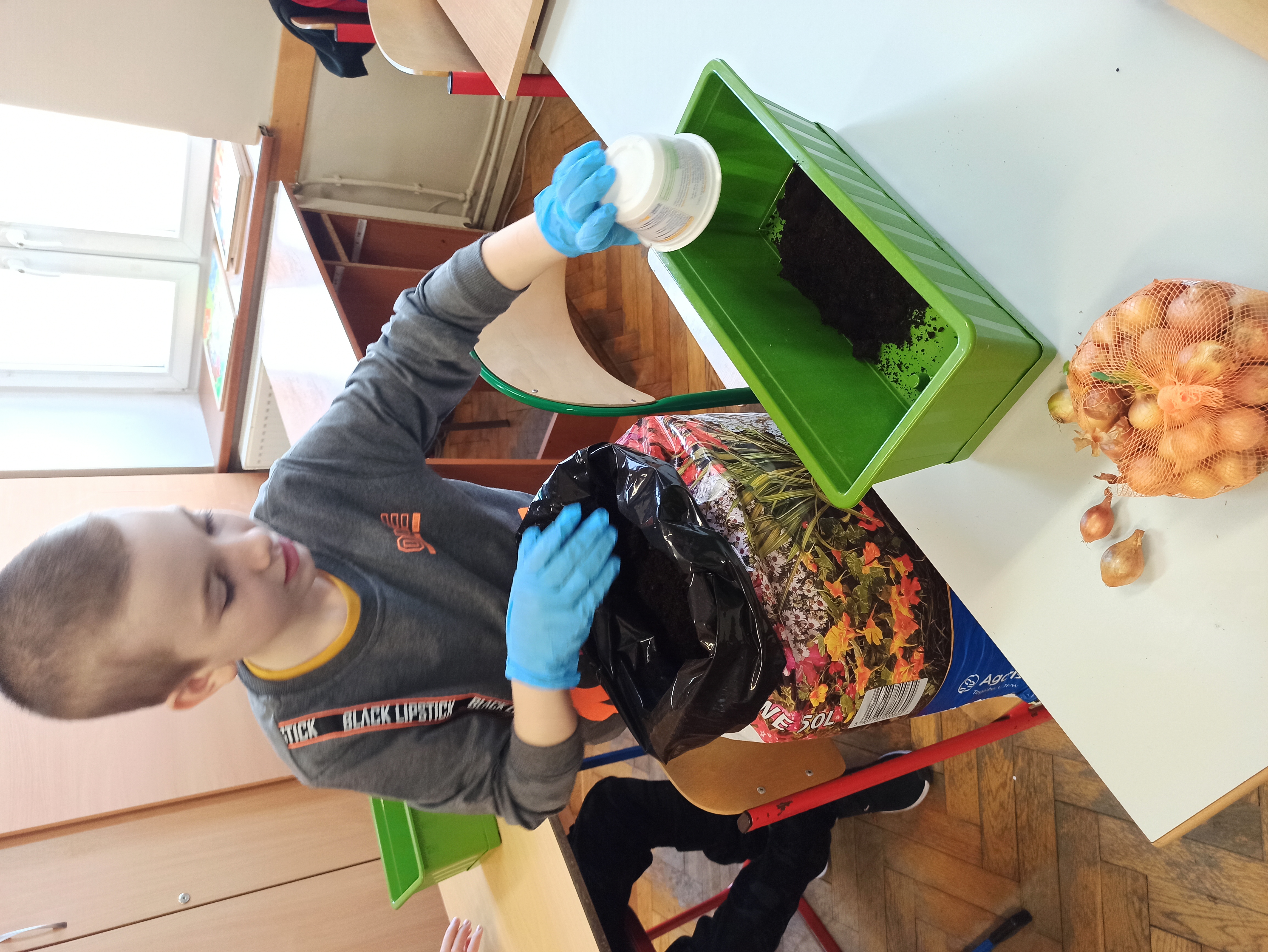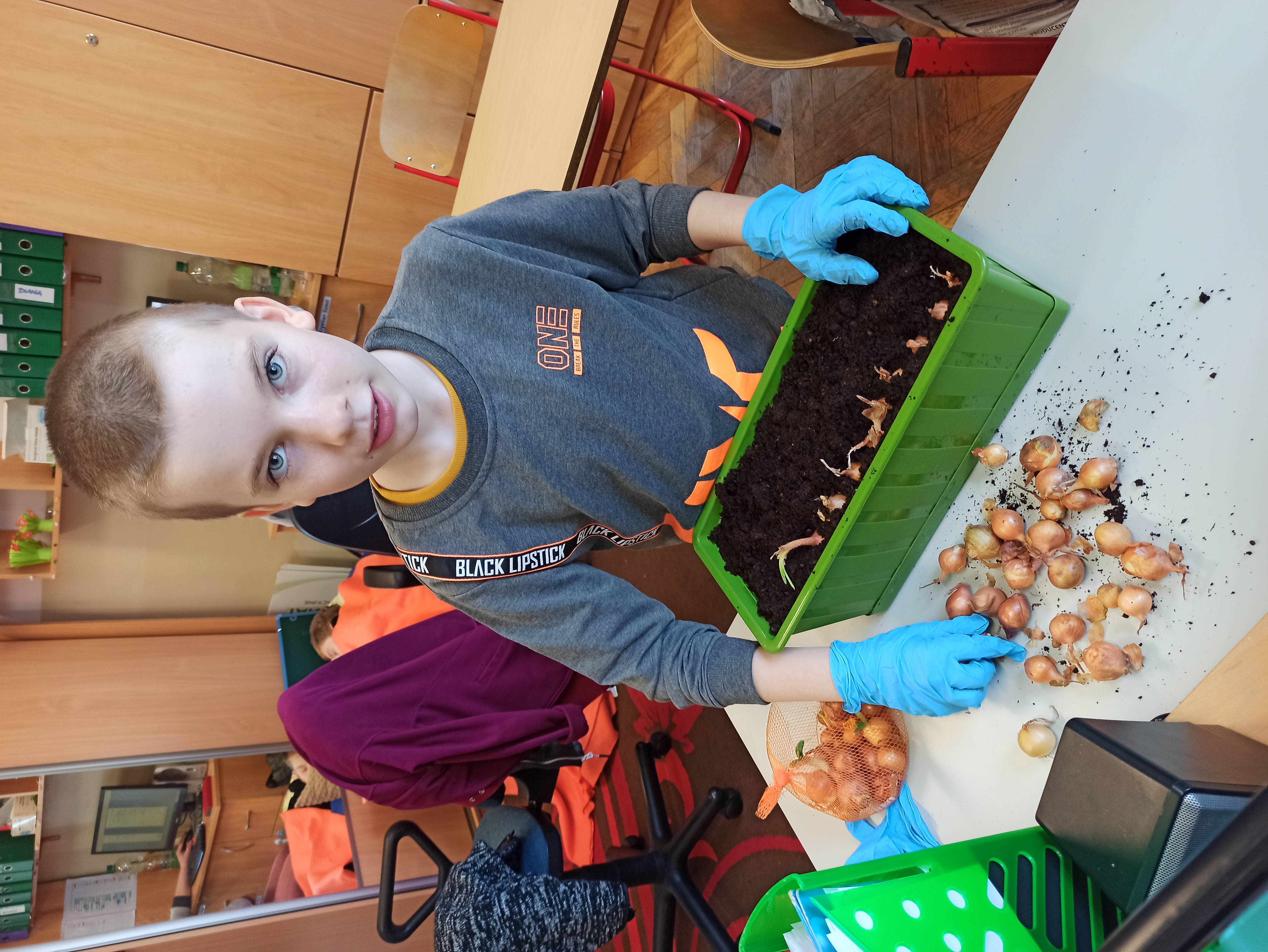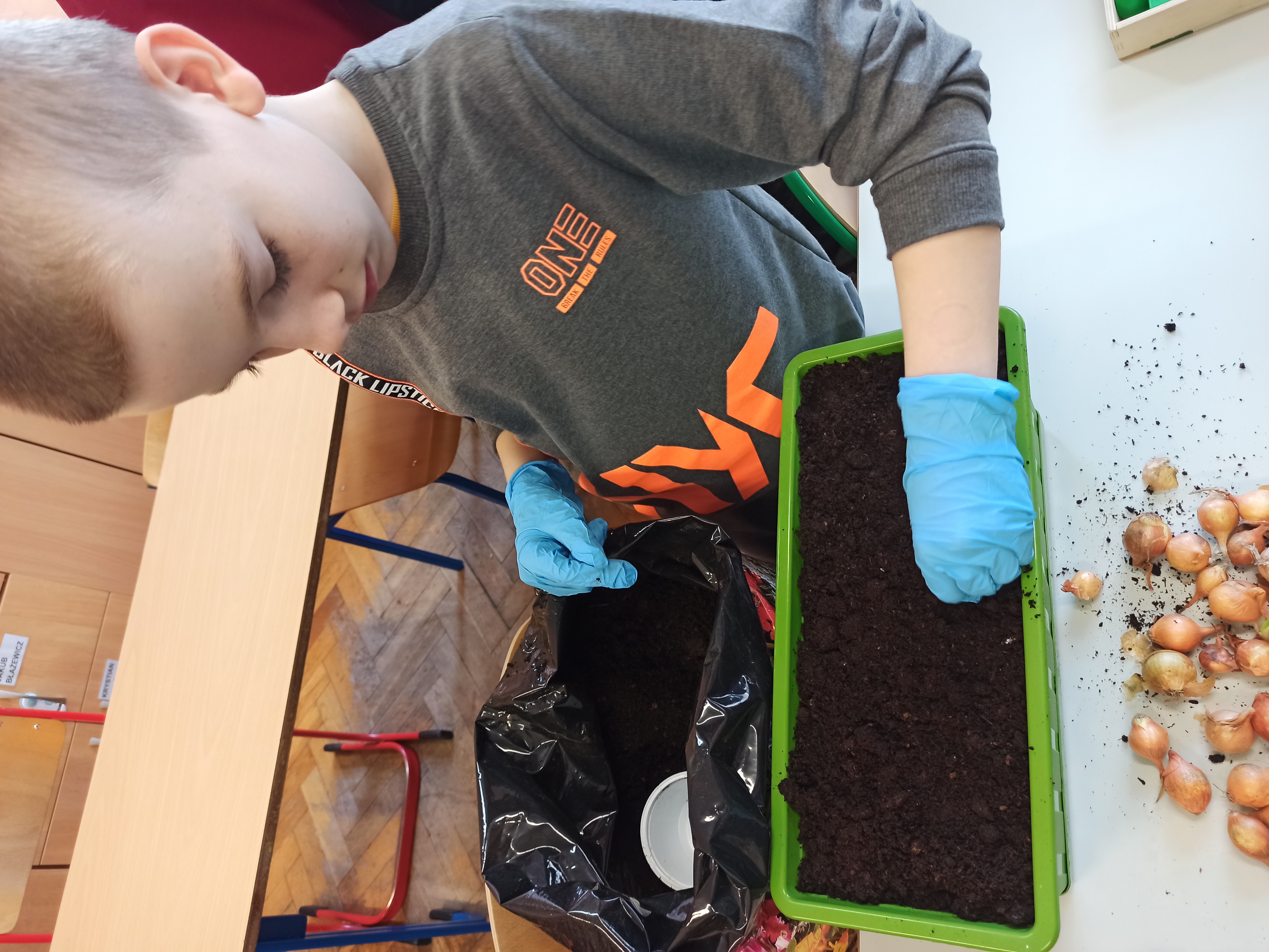 „ Sadzimy cebule”- uczniowie rozwijają umiejętności związane z poznawaniem świata roślin, sypią ziemię do przygotowanego pojemnika i sadzą sadzonki cebuli, następnie podlewają i ustawiają na parapecie.
