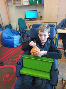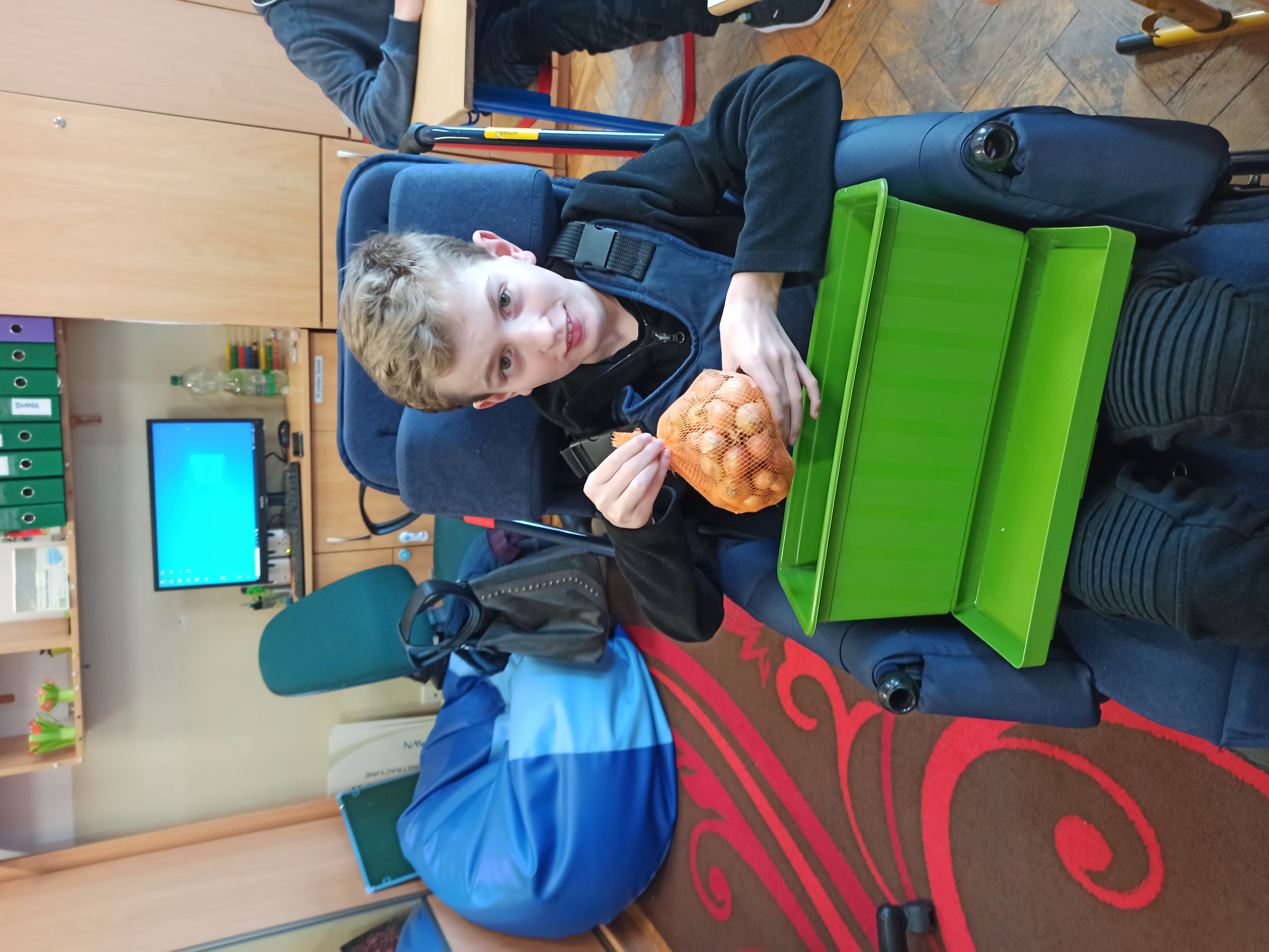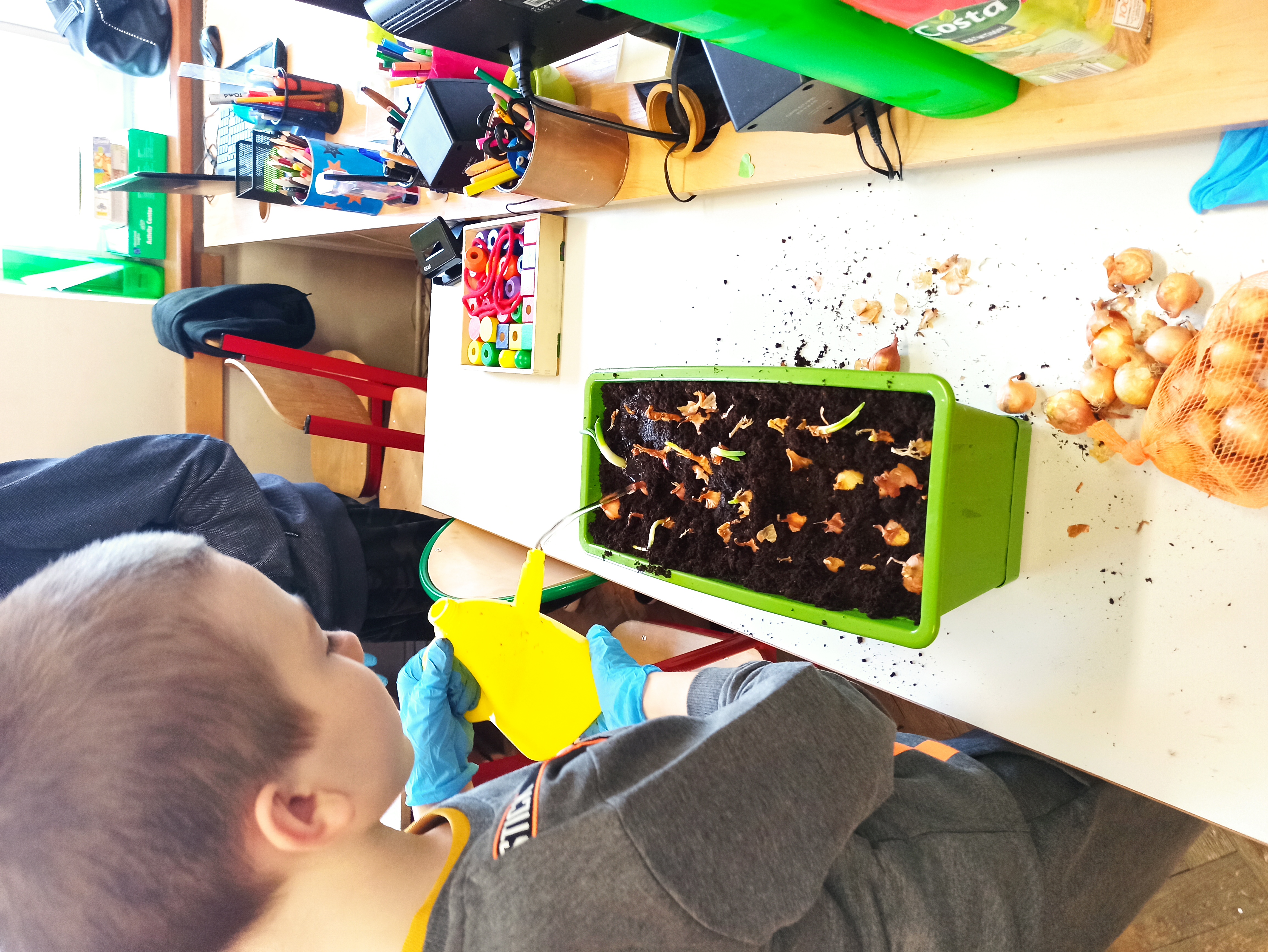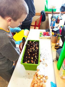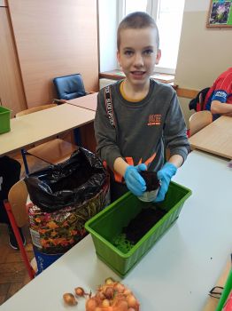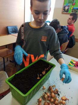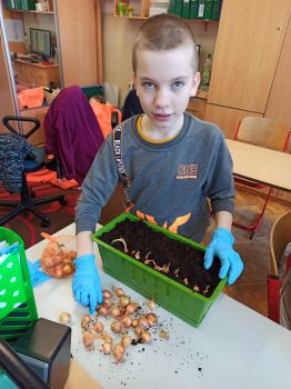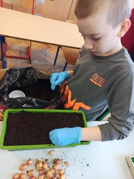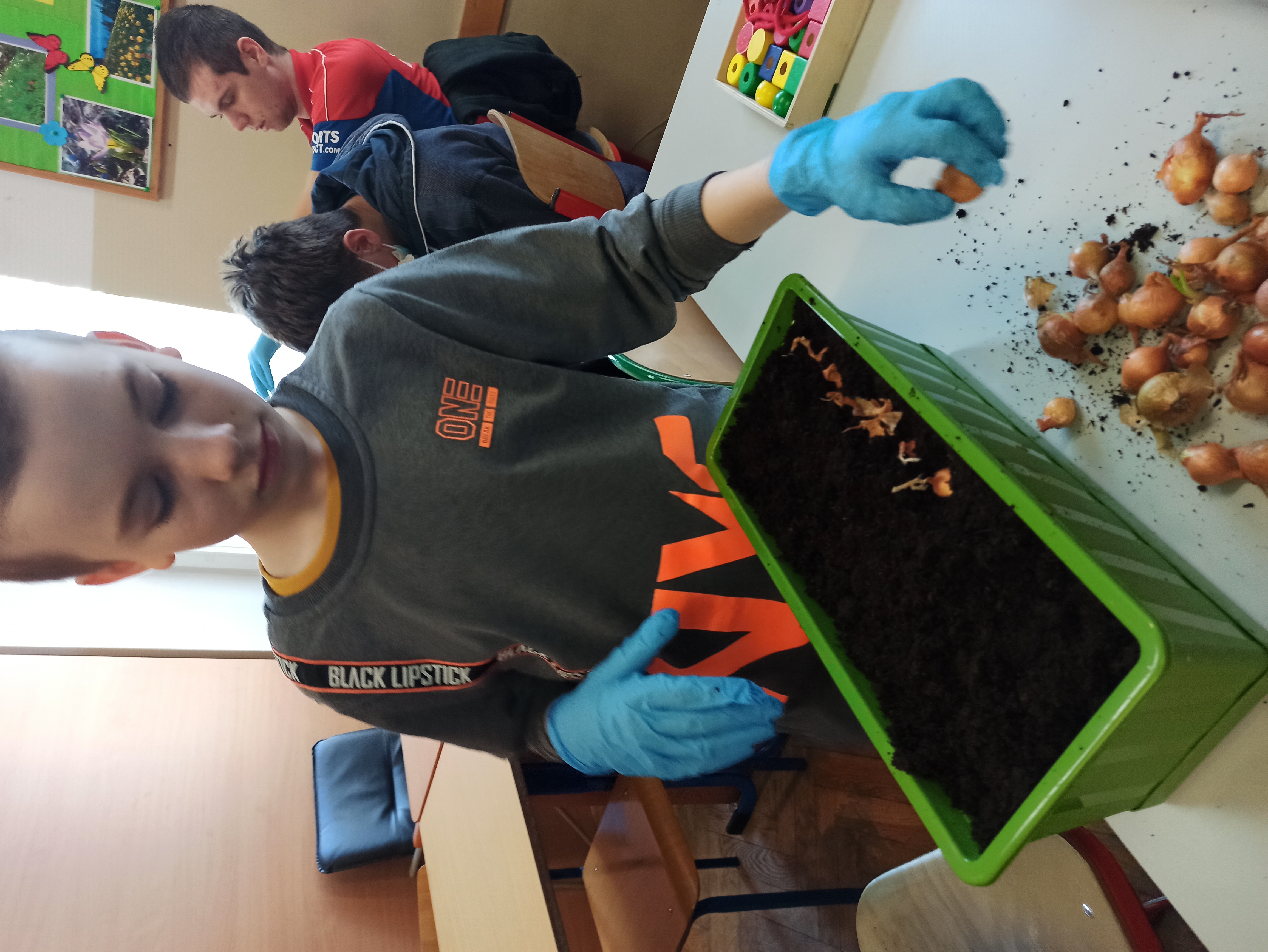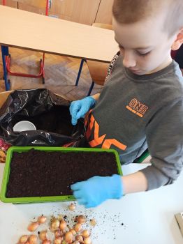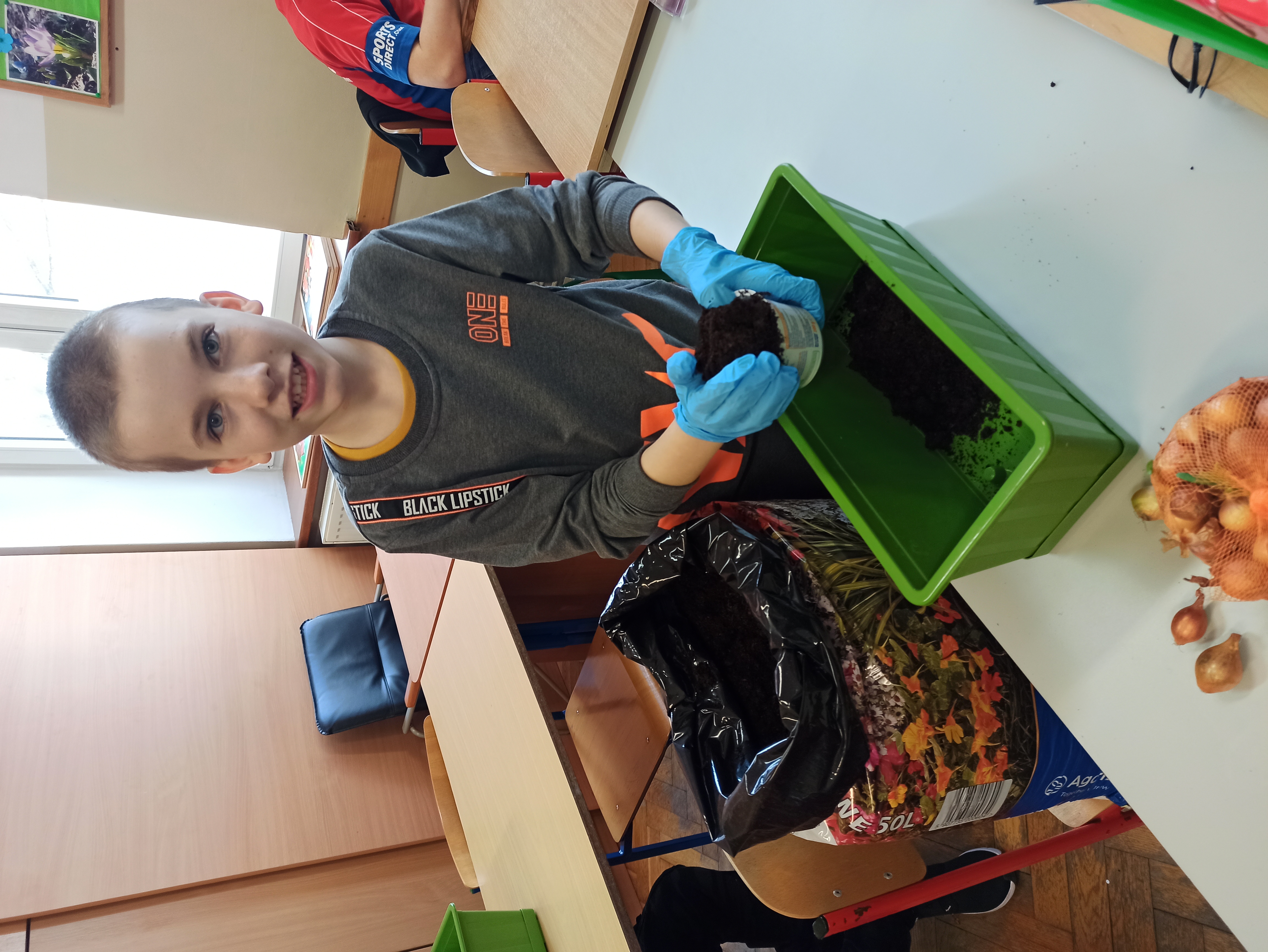 „ Sadzimy cebule”- uczniowie rozwijają umiejętności związane z poznawaniem świata roślin, sypią ziemię do przygotowanego pojemnika i sadzą sadzonki cebuli, następnie podlewają i ustawiają na parapecie.
