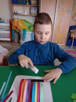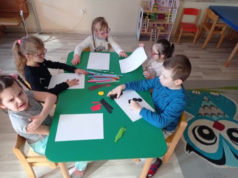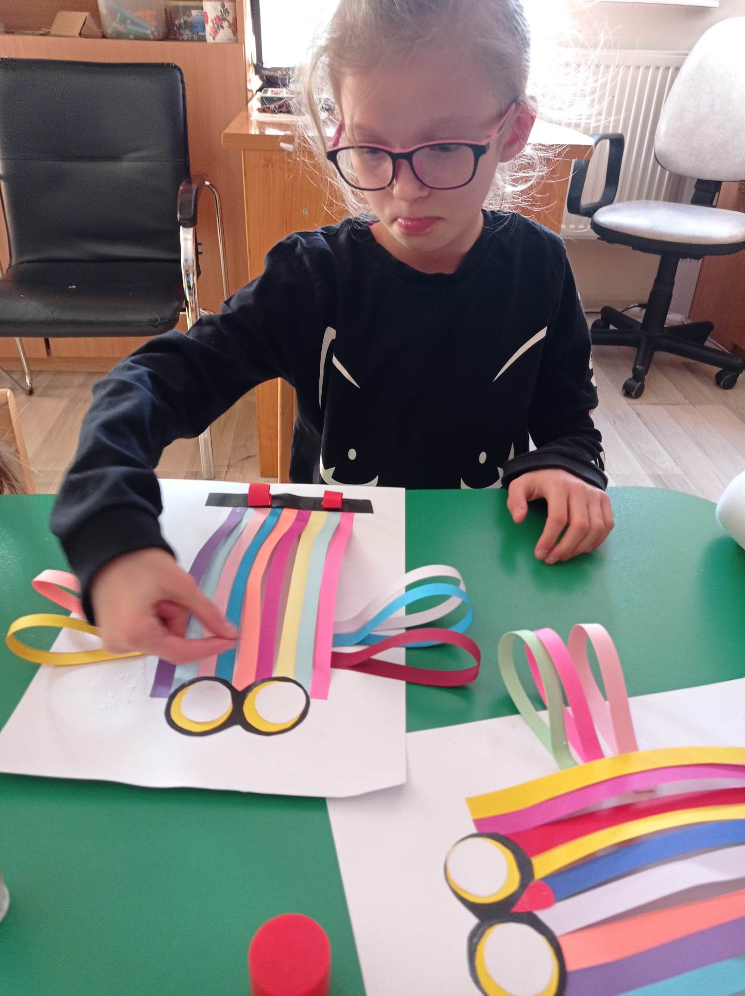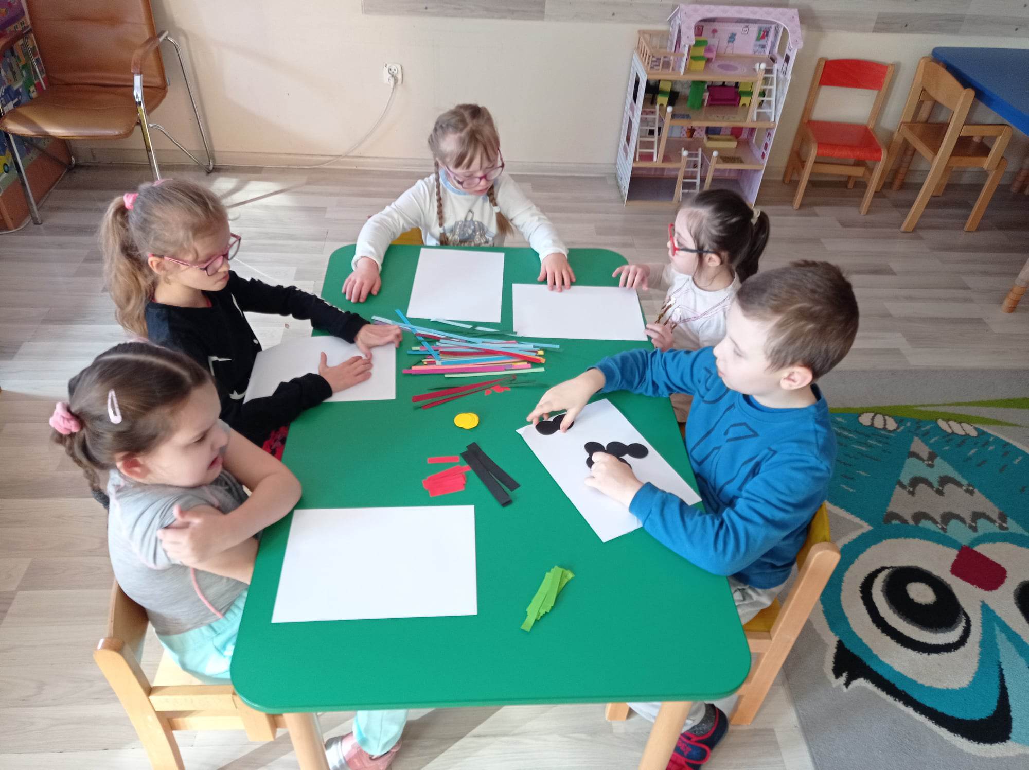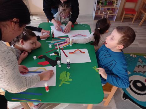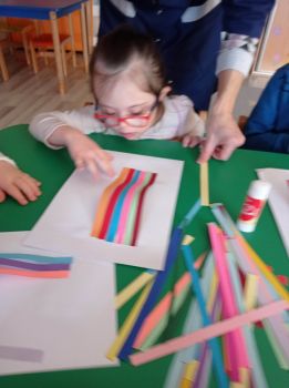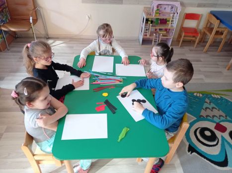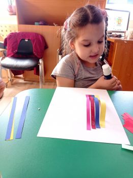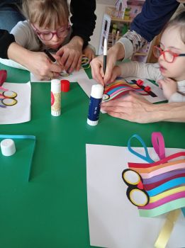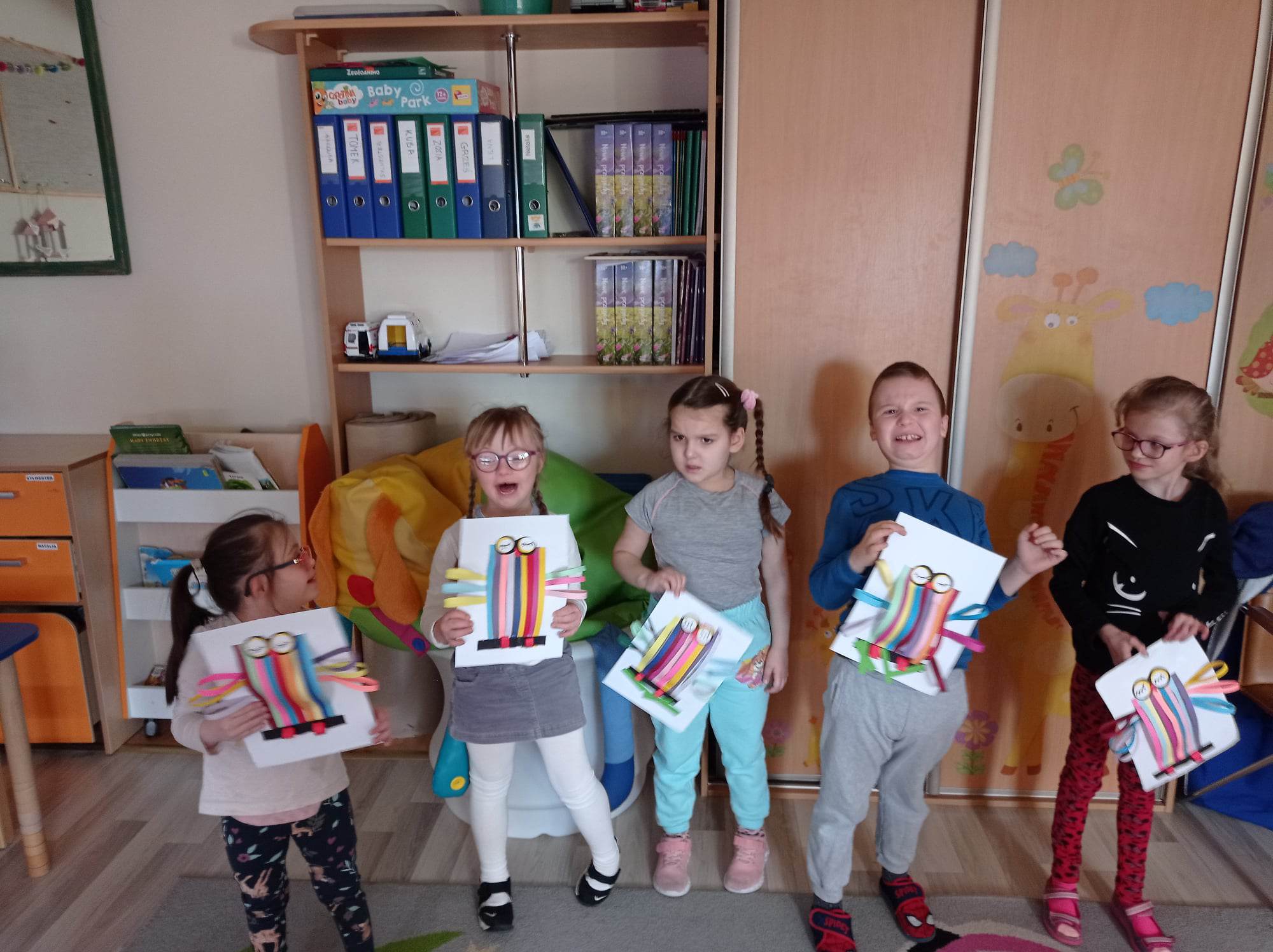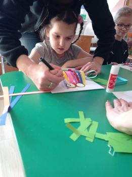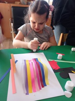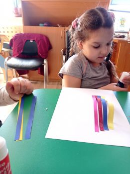 Dzieci wykonały sowy z kolorowych pasków.