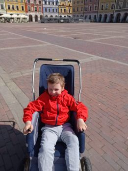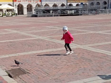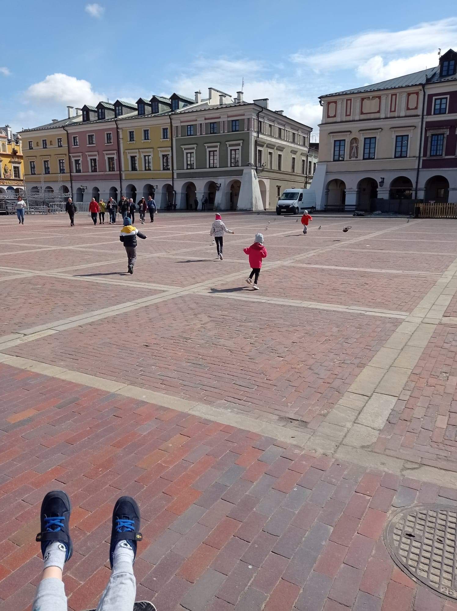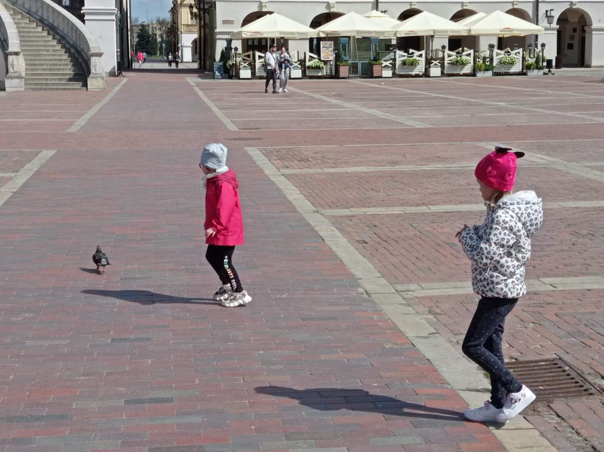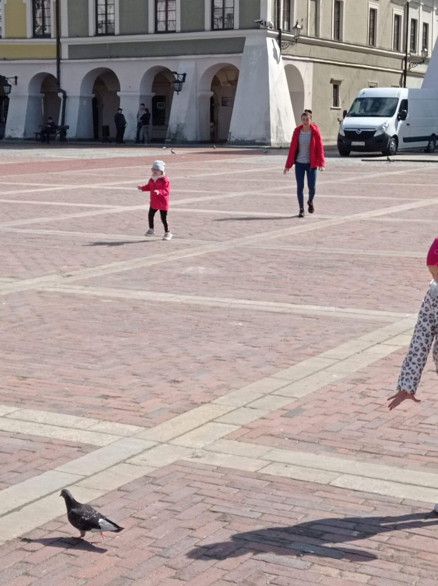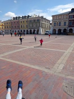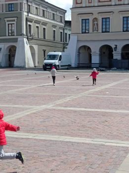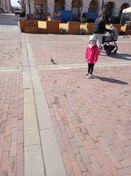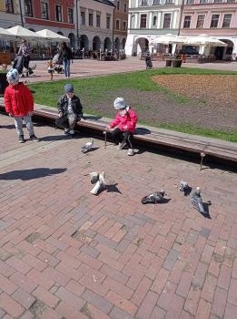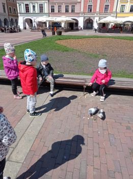 Korzystając z pięknej pogody przedszkolaki wybrały się na spacer po Zamojskiej Starówce, gdzie min. dokarmiały gołębie.