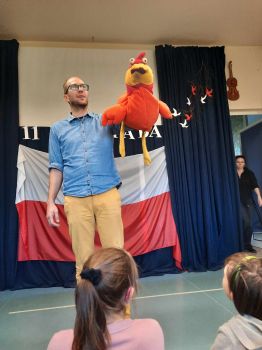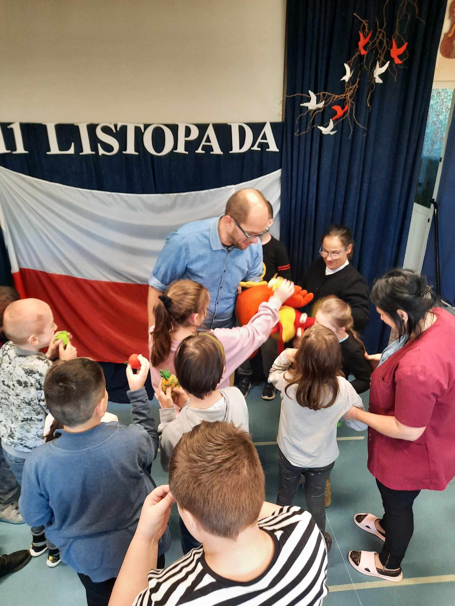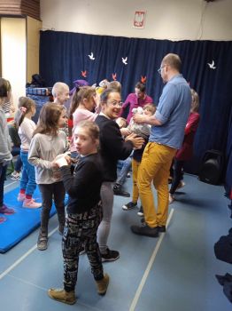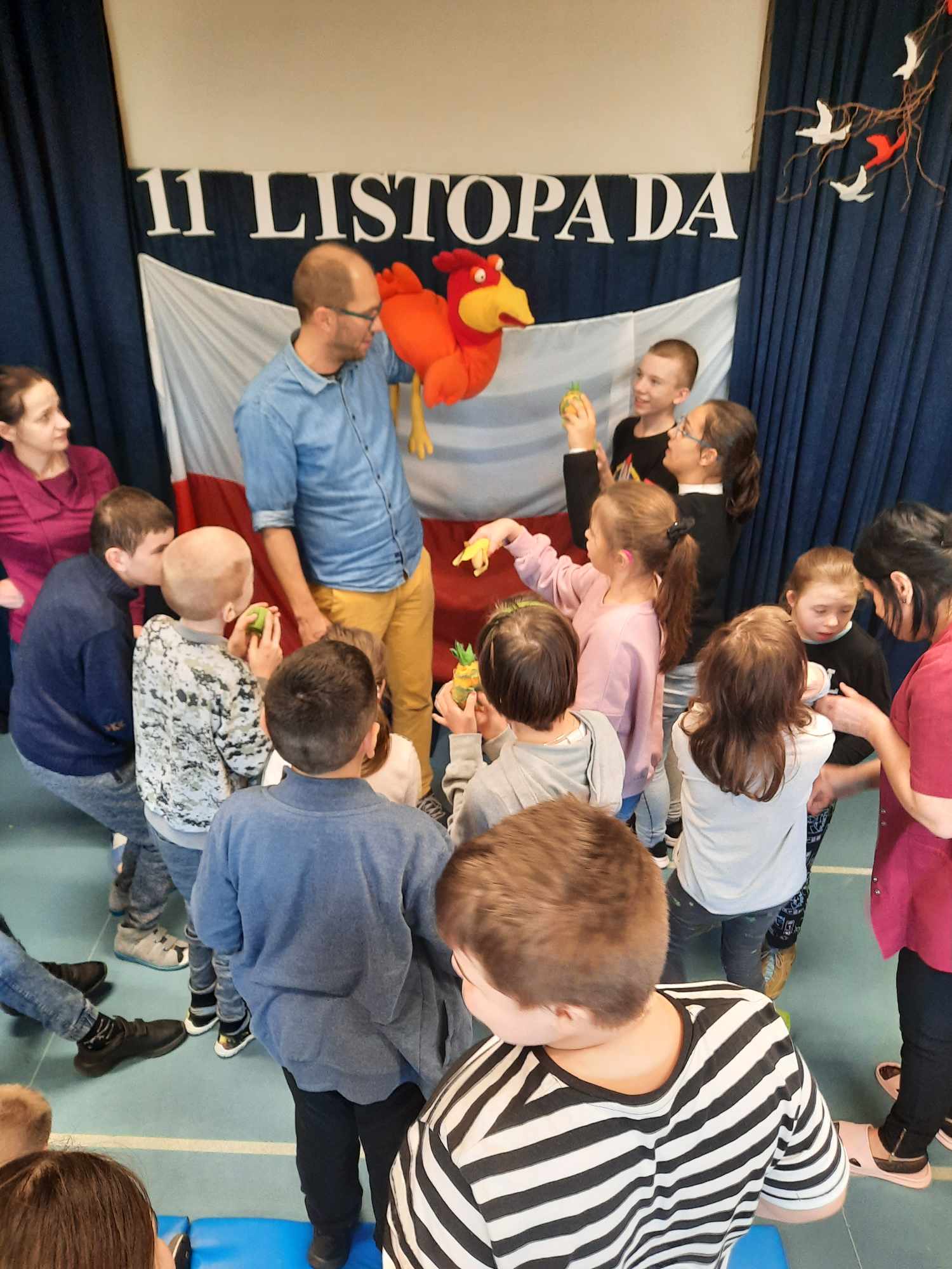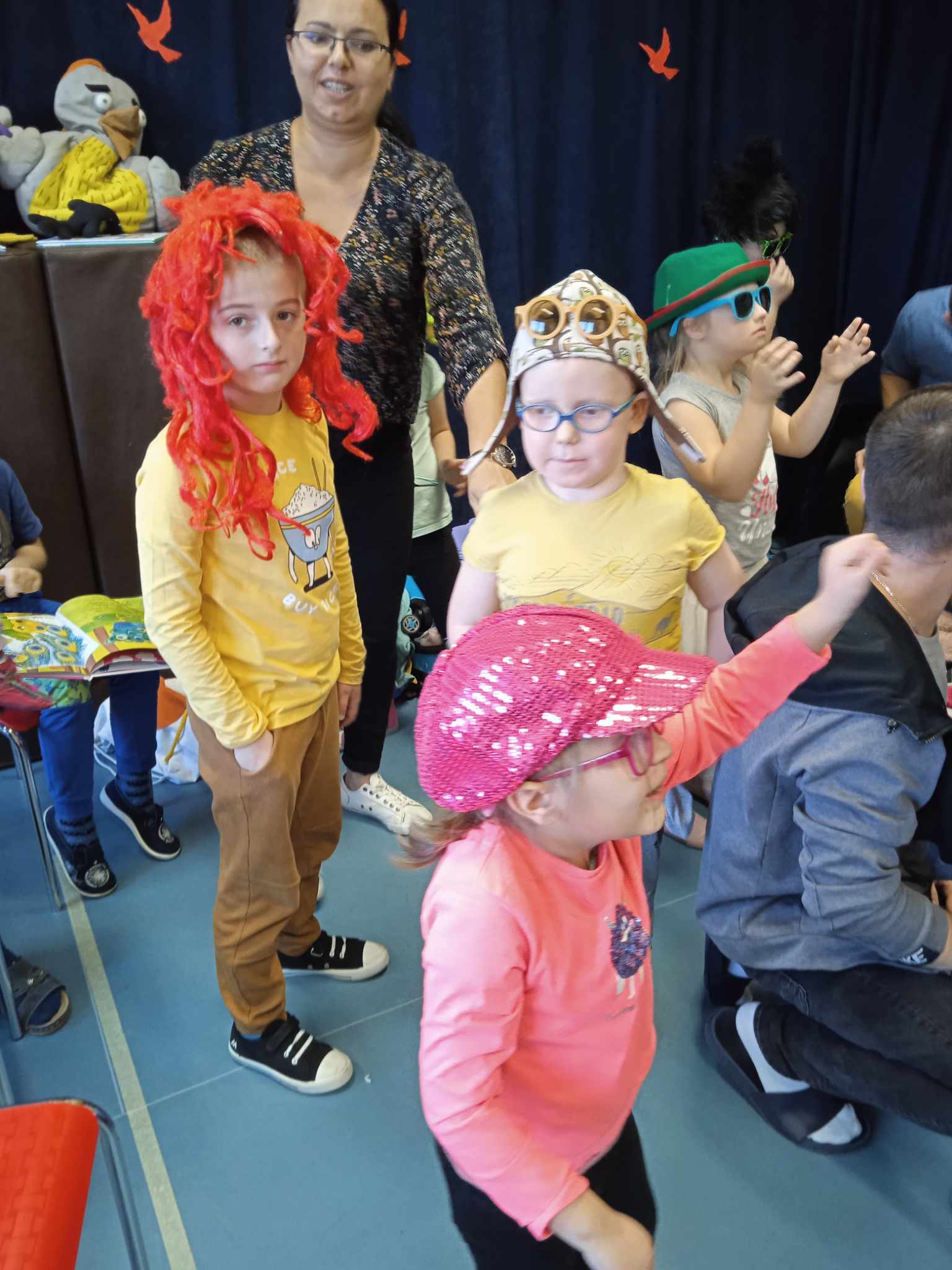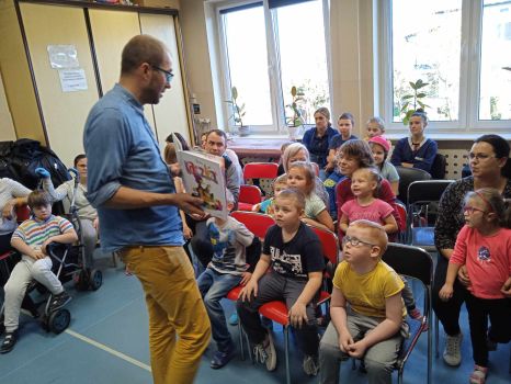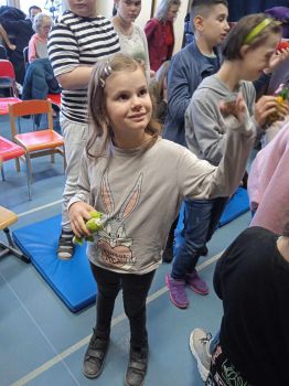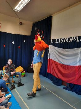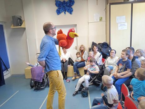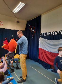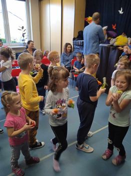 Spotkanie autorskie było pełne wrażeń, radości i zabaw. Fruwały piórka i balony. Było bardzo kolorowo bo modowo. Dzieci karmiły kurę samymi zdrowymi produktami - warzywami i owocami.