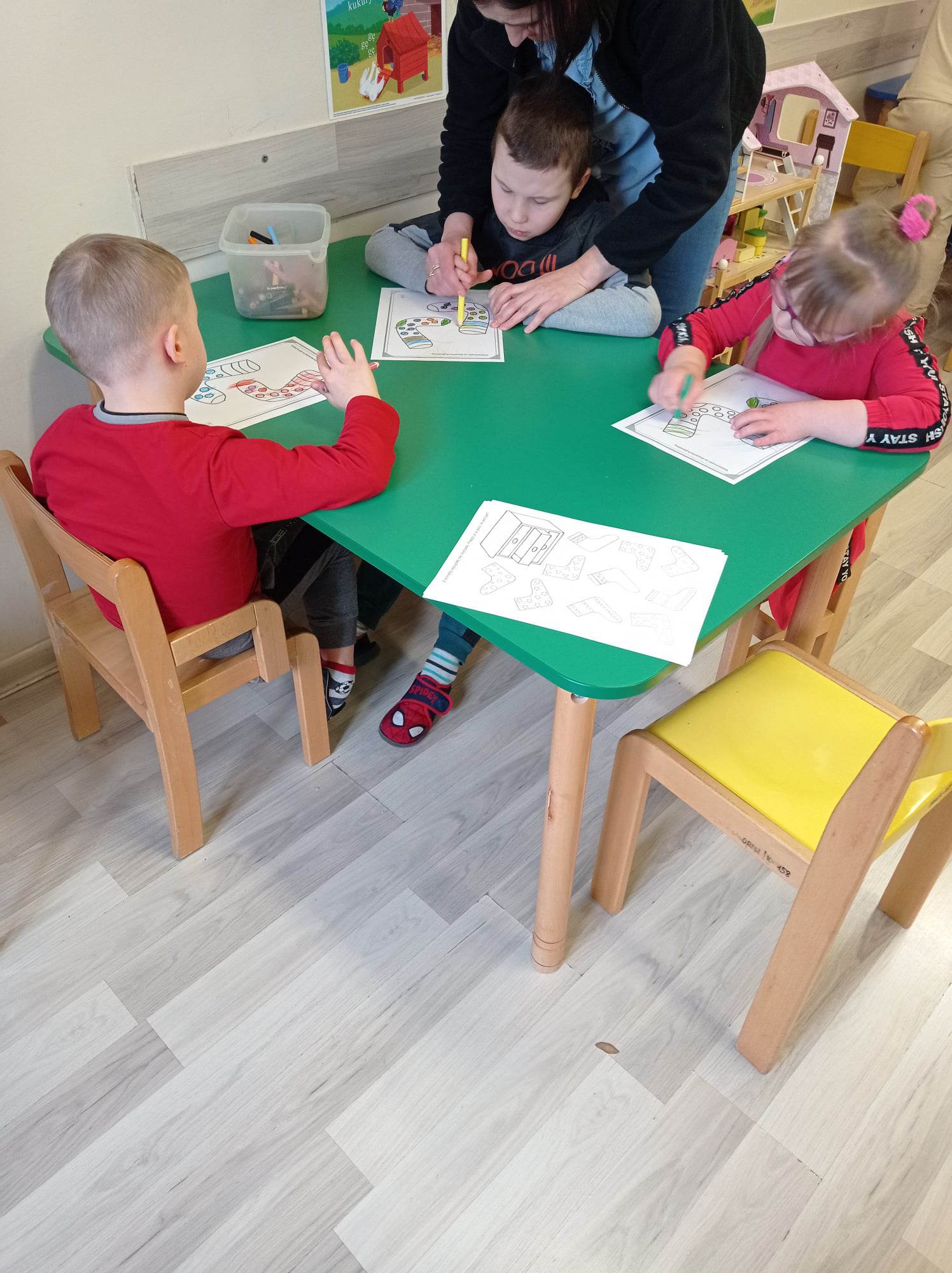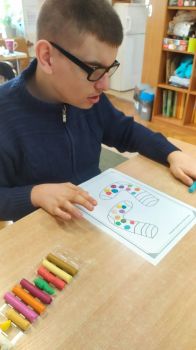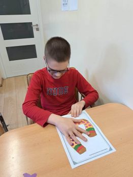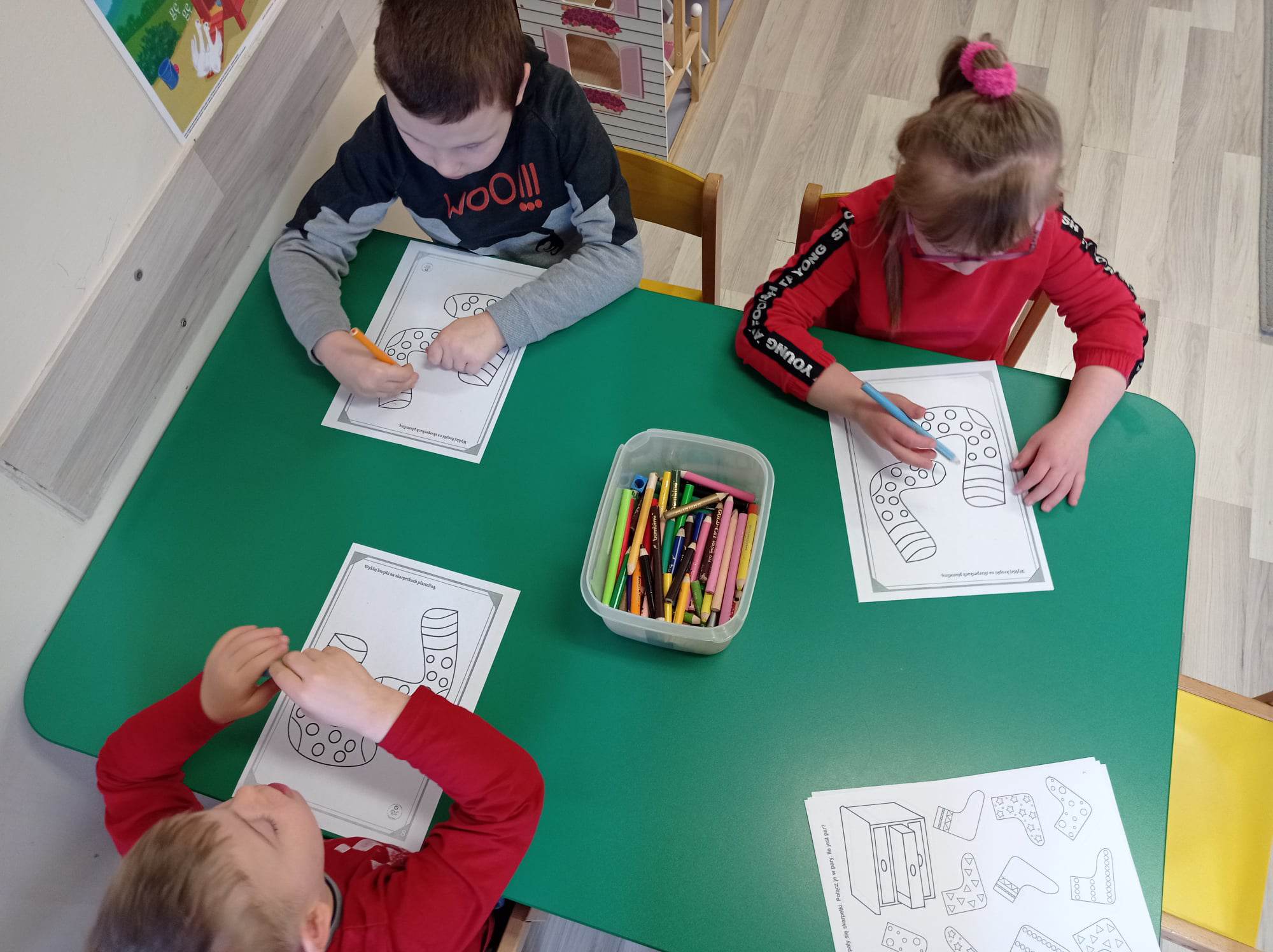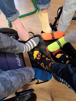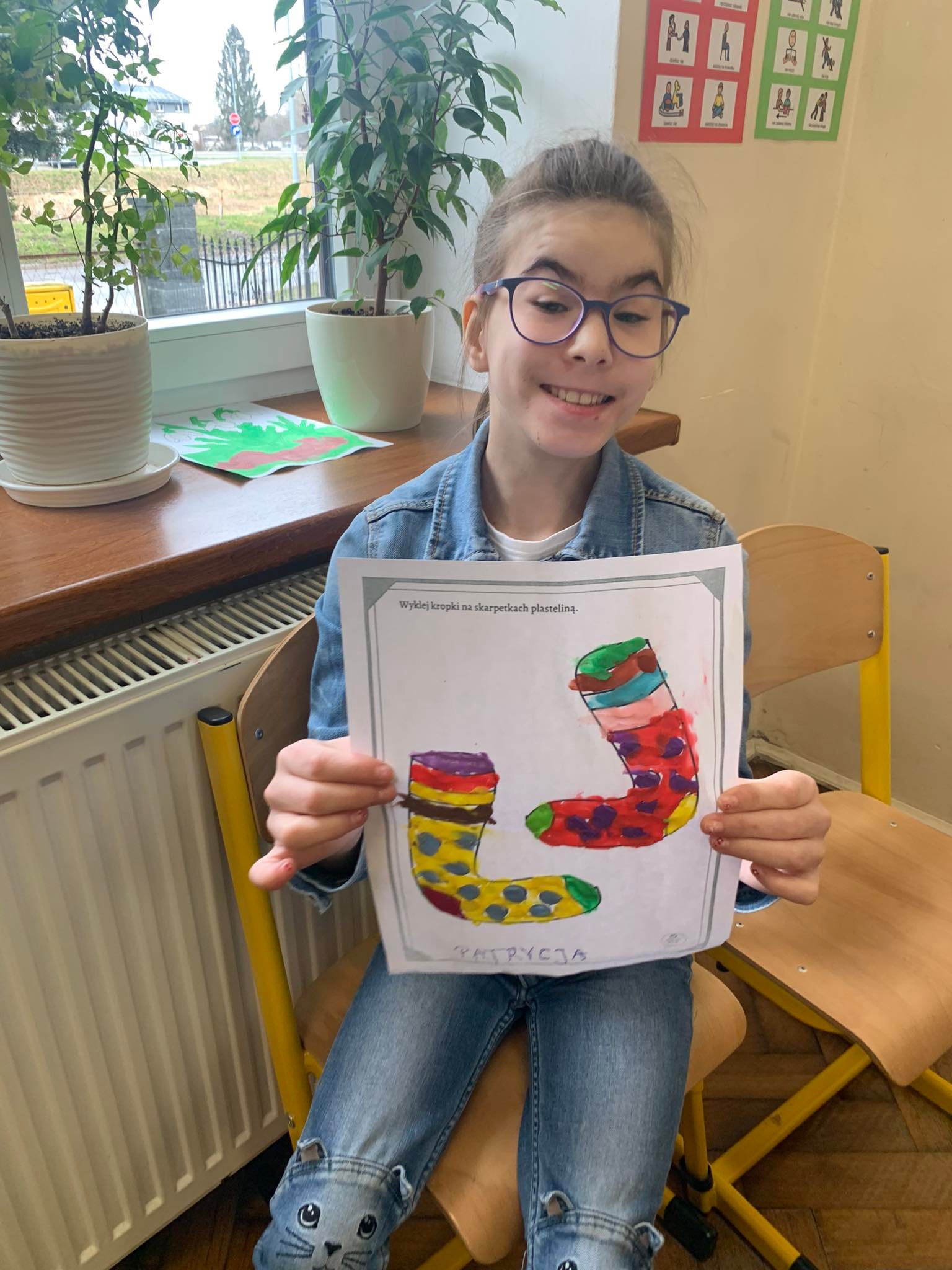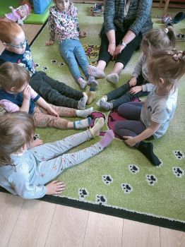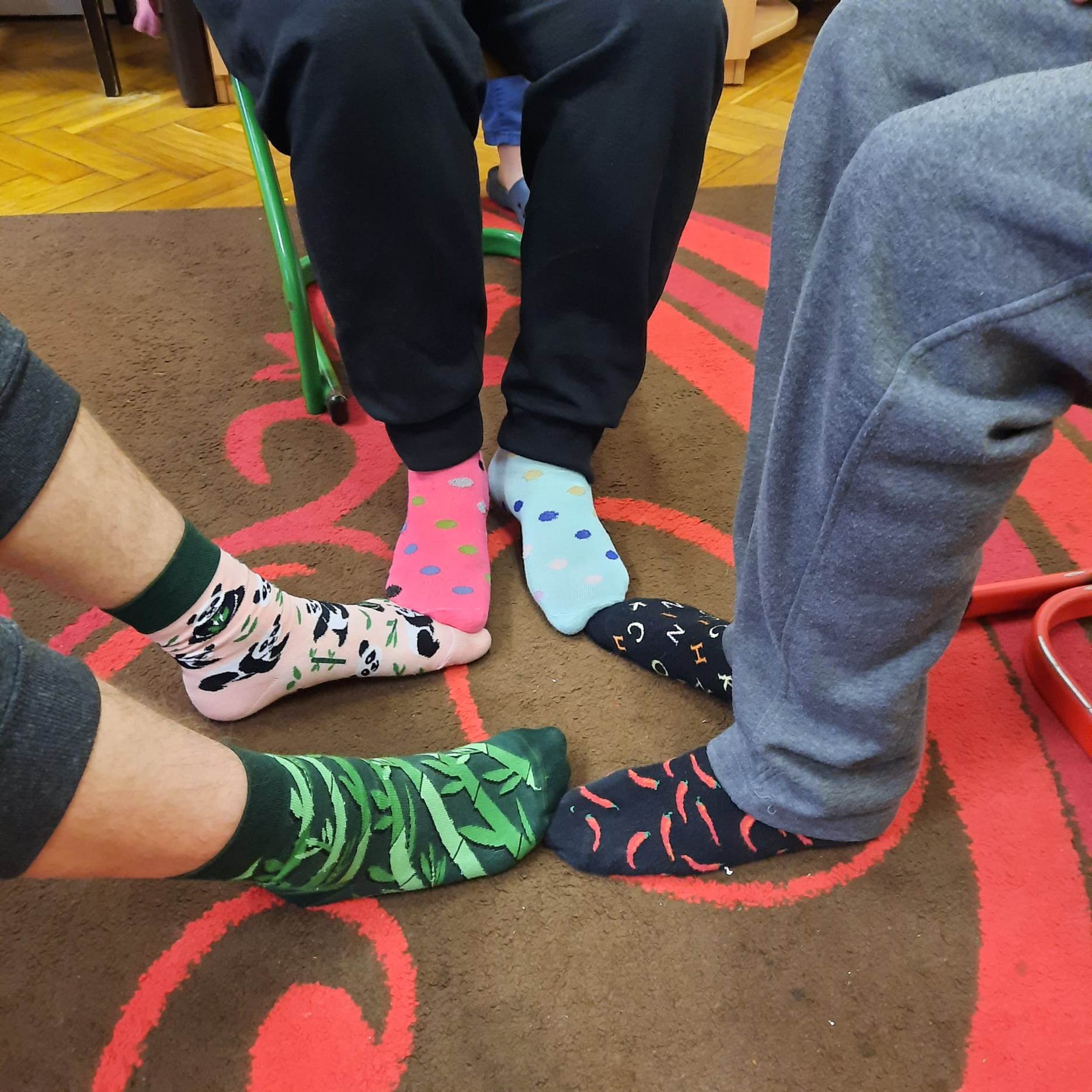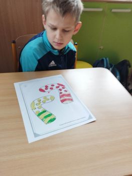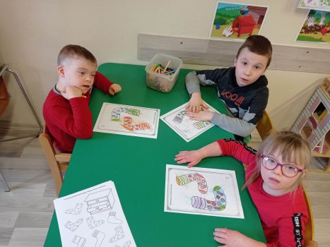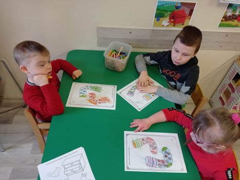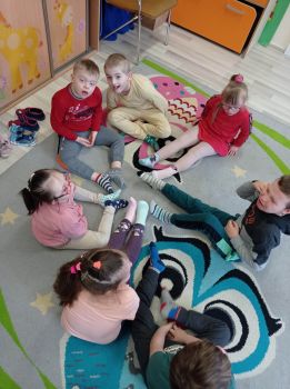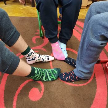 Dzieci pokolorowały skarpety nie do pary i zaprezentowały w ramach solidarności swoje skarpety nie do pary.