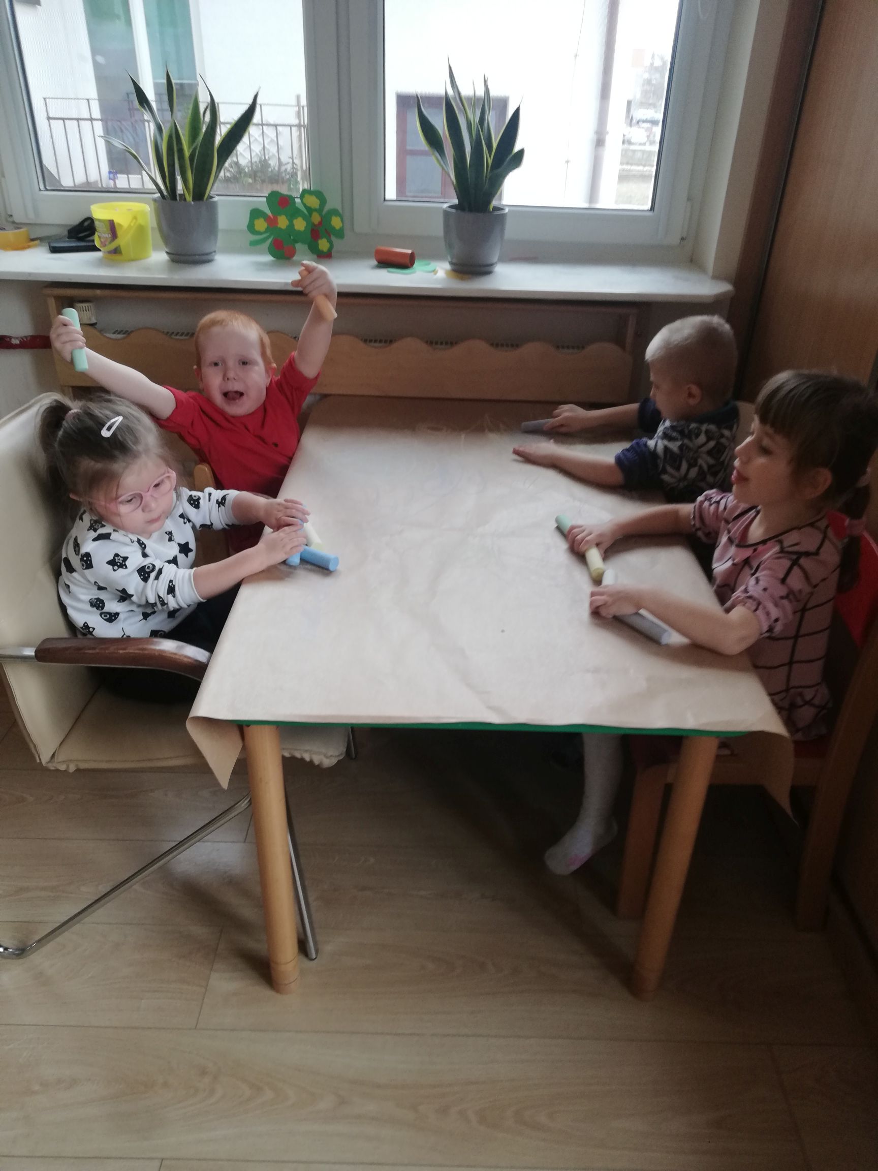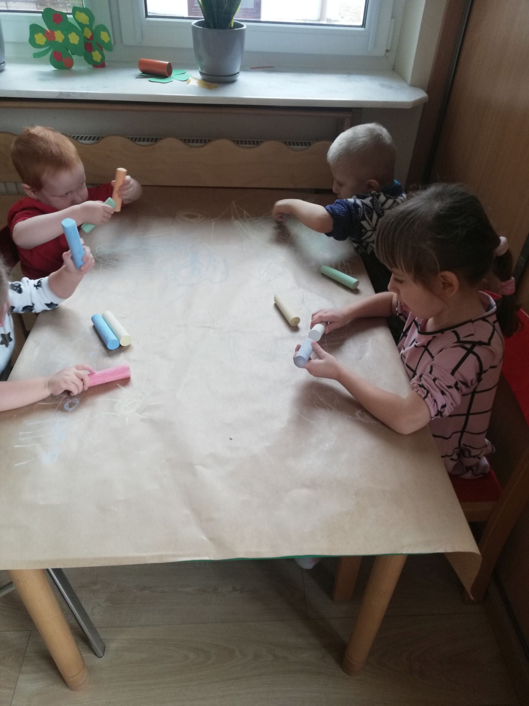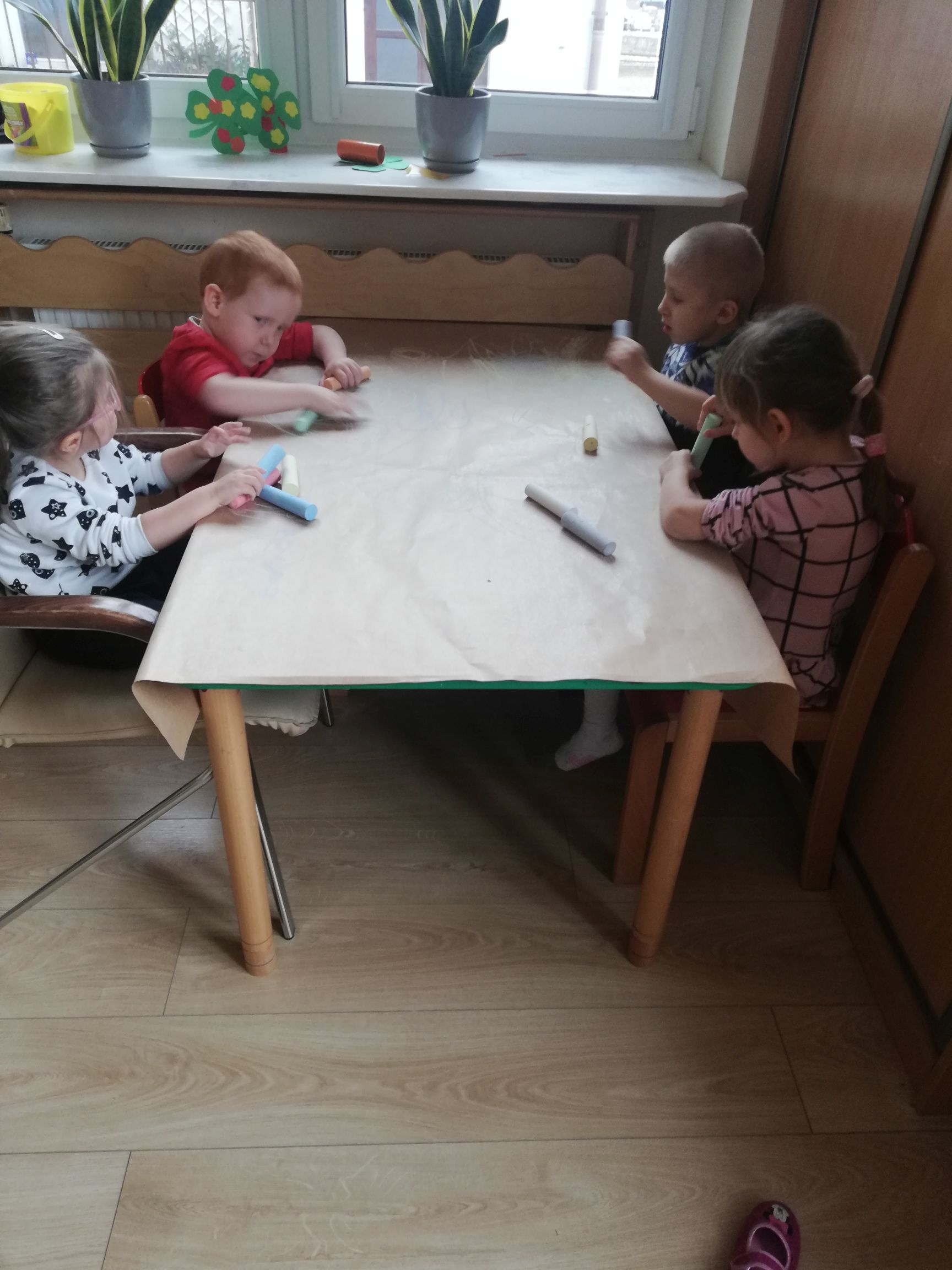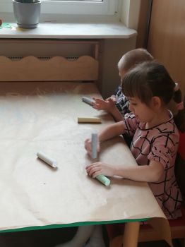 Na dworze plucha i ponuro a przedszkolaki z grupy IV czekając na słońce i mnóstwo wiosennych kolorów w przyrodzie wykonali kredą Wiosenny krajobraz.. Praca wywołała dużo uśmiechu i zabawy u dzieci.