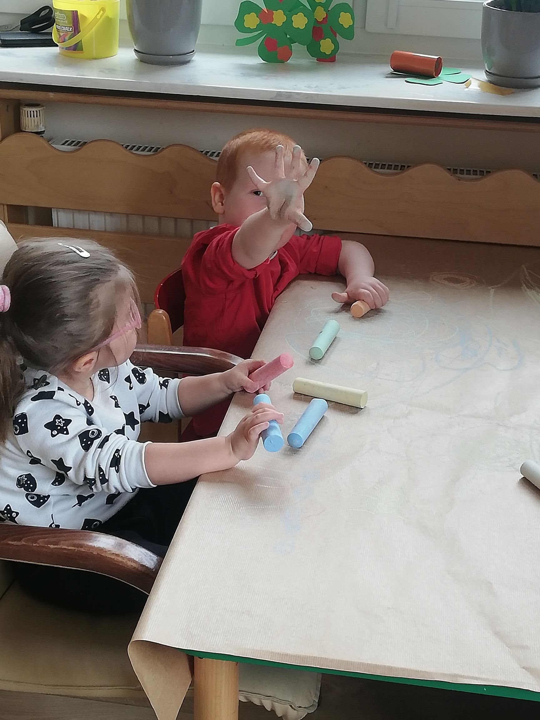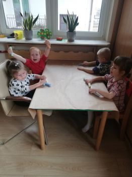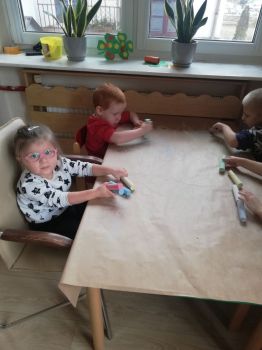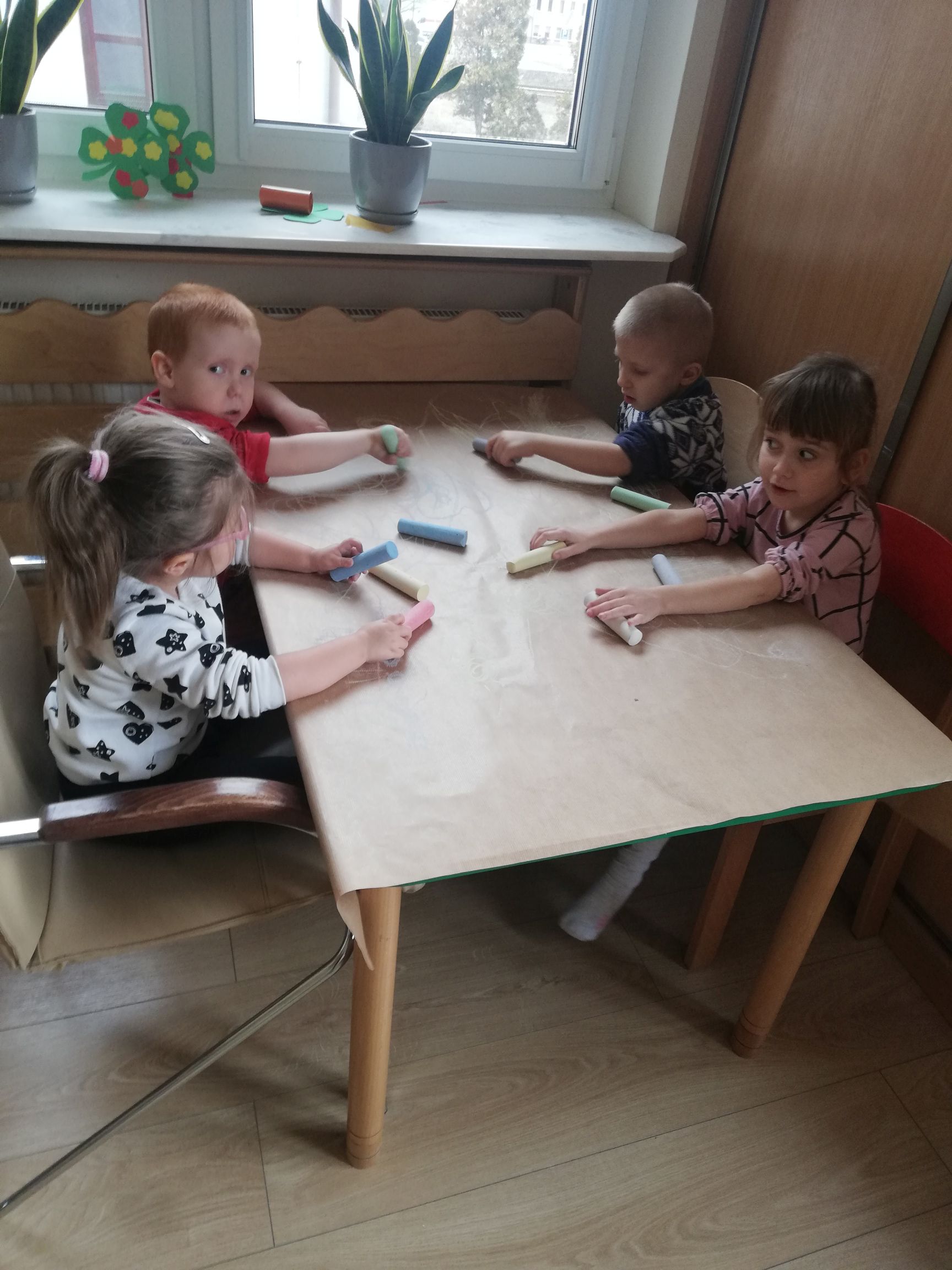 Na dworze plucha i ponuro a przedszkolaki z grupy IV czekając na słońce i mnóstwo wiosennych kolorów w przyrodzie wykonali kredą Wiosenny krajobraz.. Praca wywołała dużo uśmiechu i zabawy u dzieci.