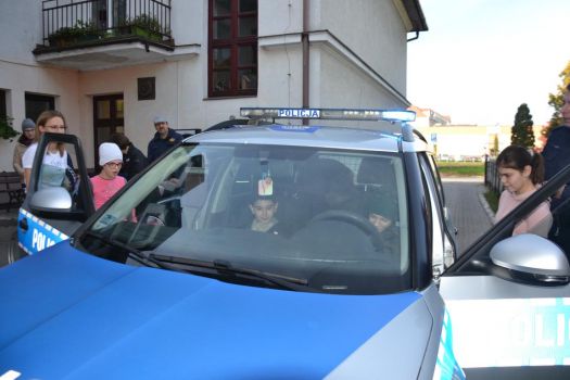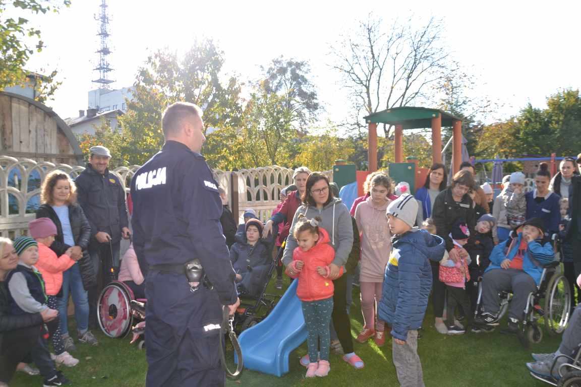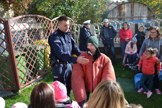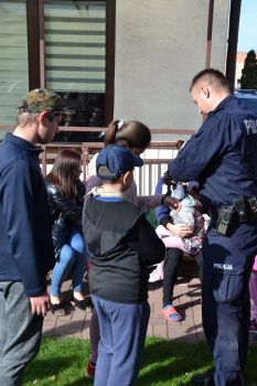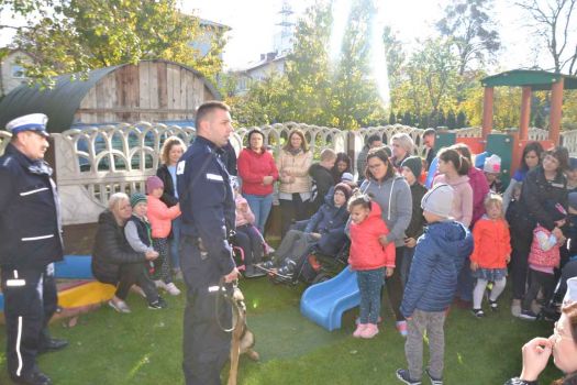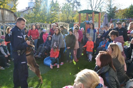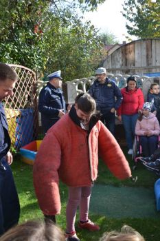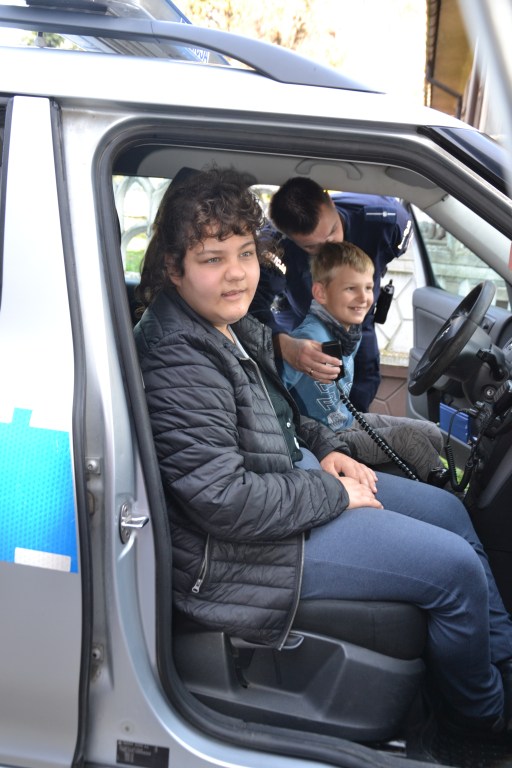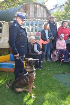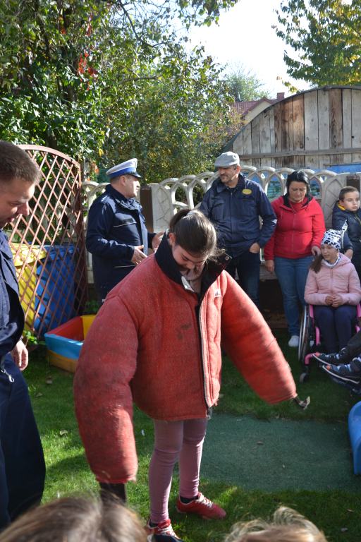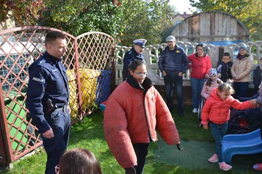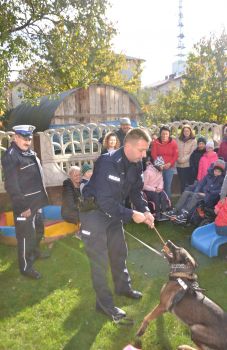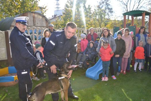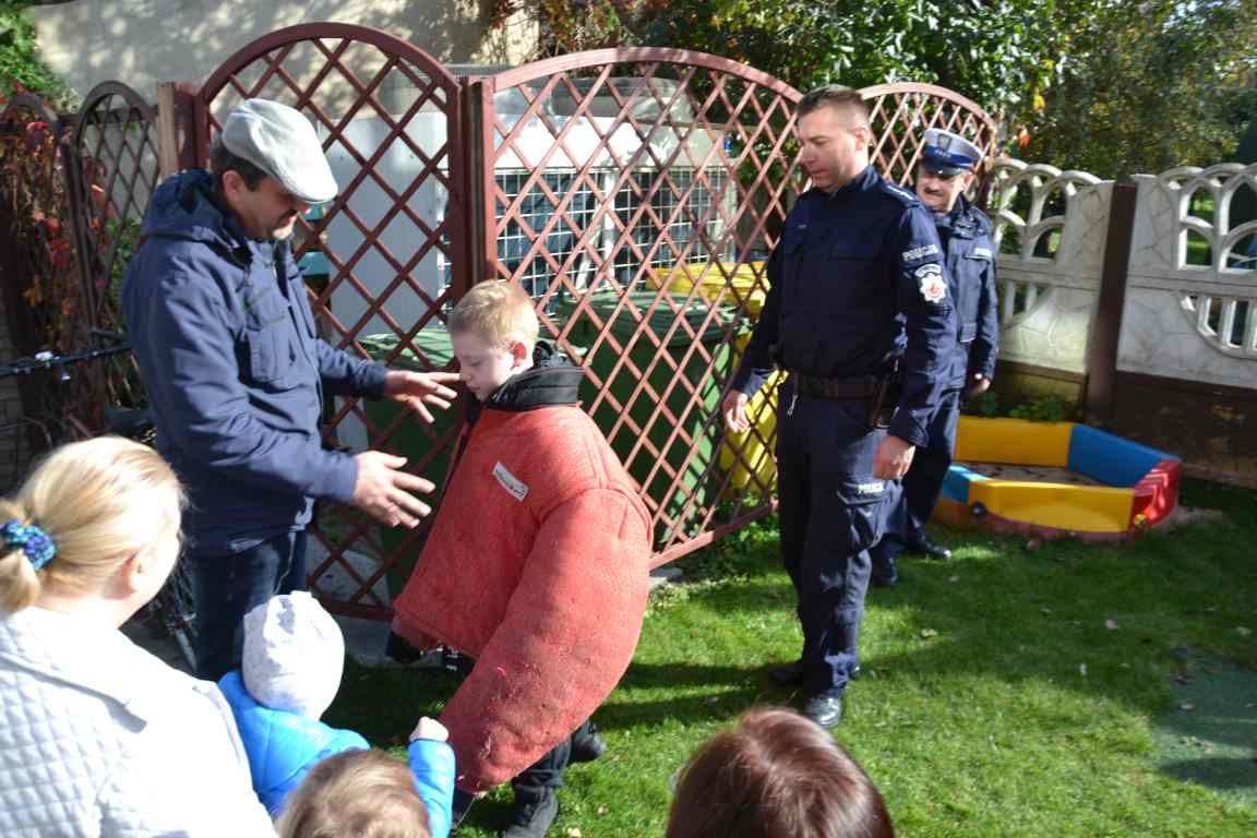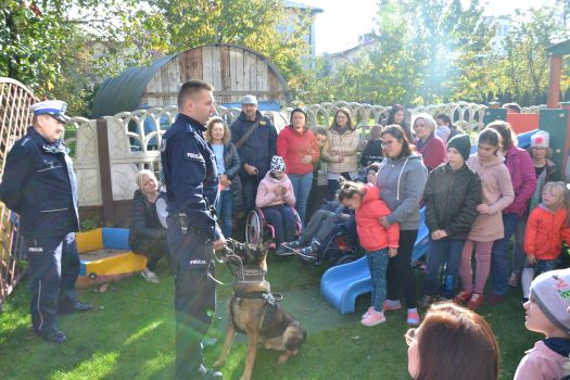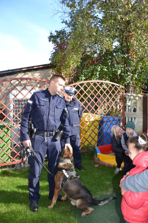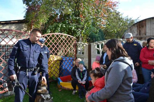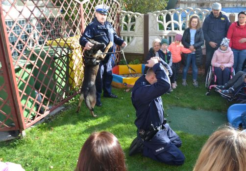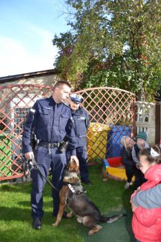 Największą atrakcją był pokaz umiejętności psa policyjnego. Wychowankowie dowiedzieli się w jaki sposób należy się zachować w przypadku spotkania z agresywnym zwierzęciem. Panowie zaprezentowali bezpieczne pozycje, które należy przyjąć w przypadku ataku ze strony psa. Chętni wychowankowie mieli możliwość zmierzenia odzieży ochronnej wykorzystywanej podczas tresury psa. Dużym zainteresowaniem cieszyła się również prezentacja wyposażenia policyjnego niezbędnego podczas wykonywania pracy oraz obejrzenia od środka radiowozu policyjnego.