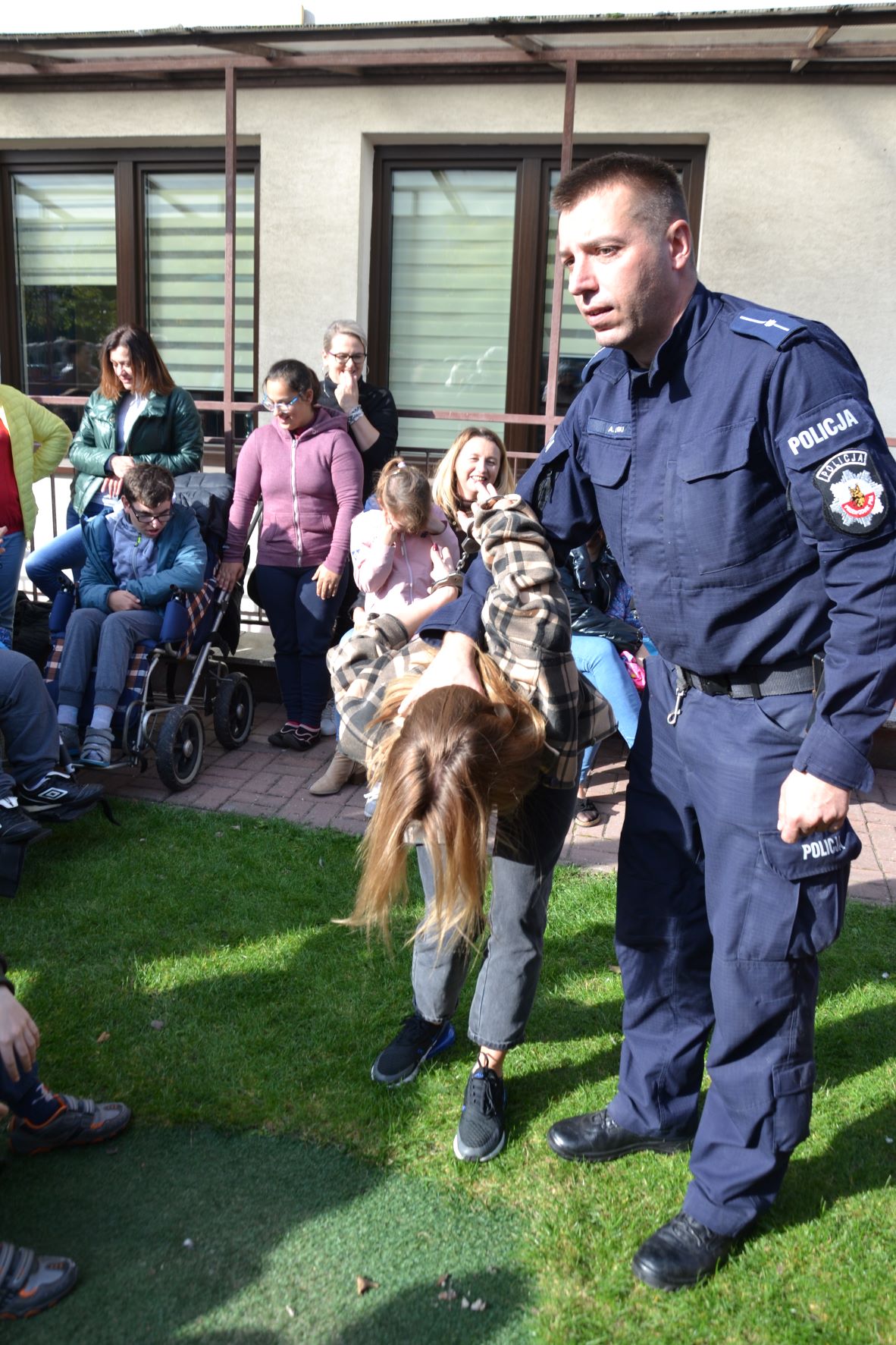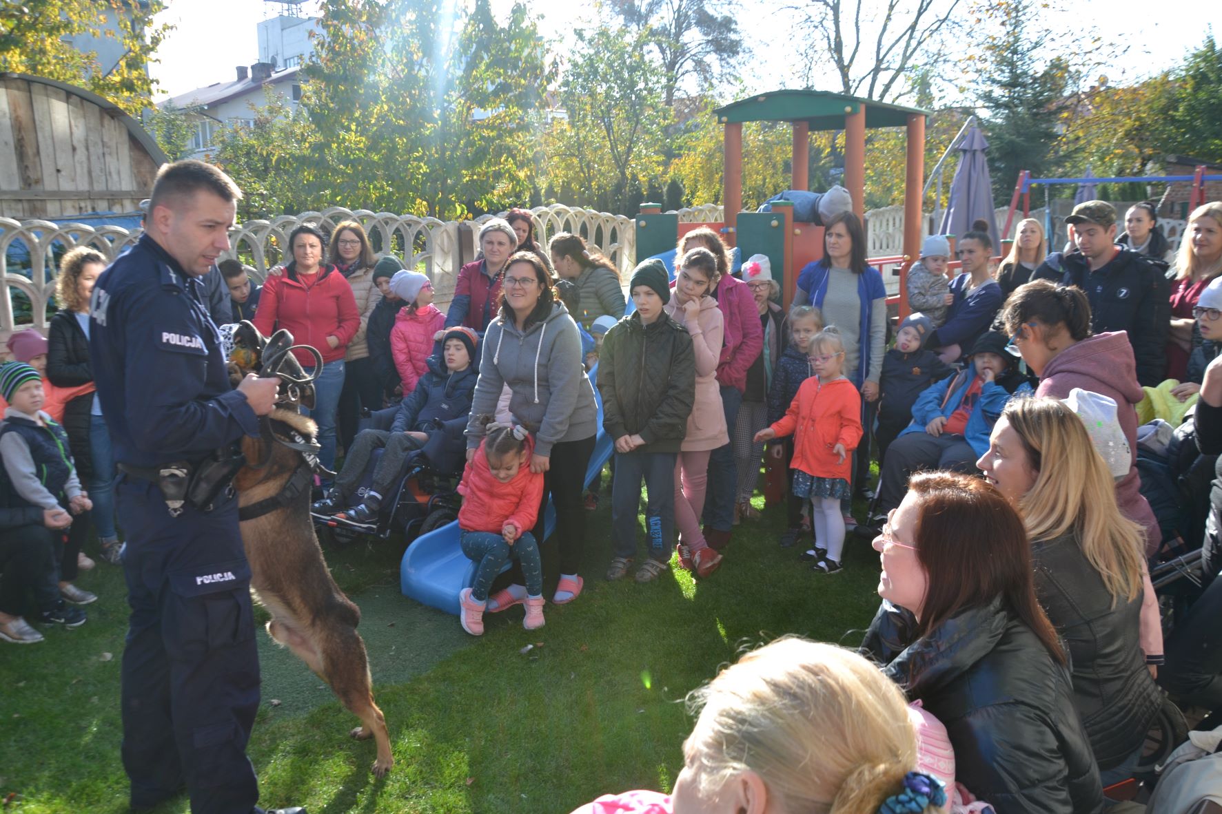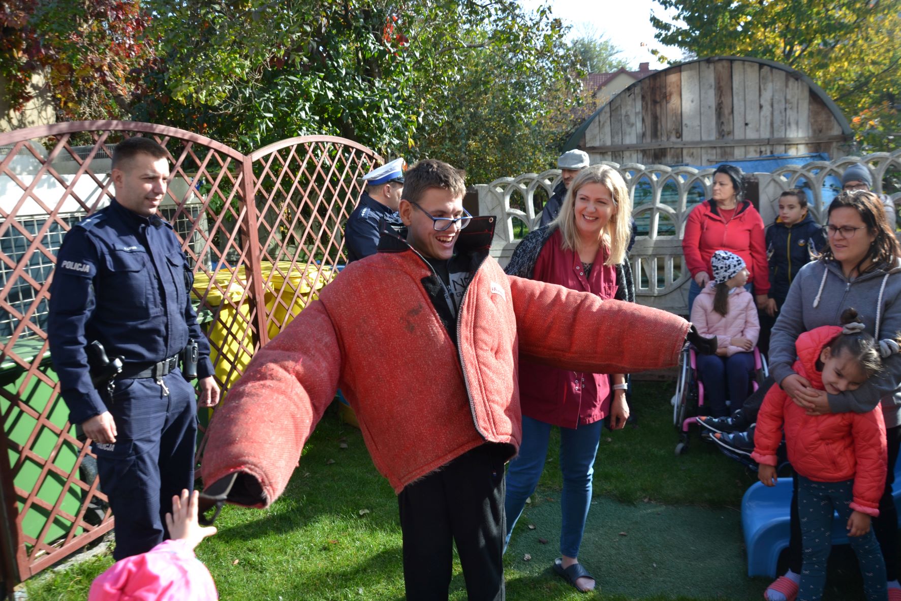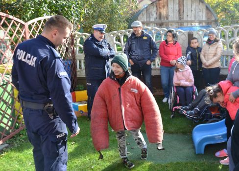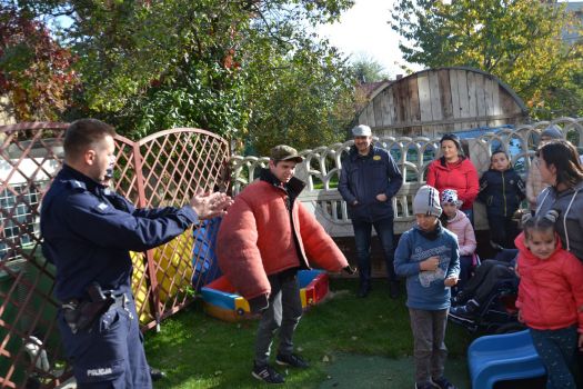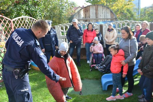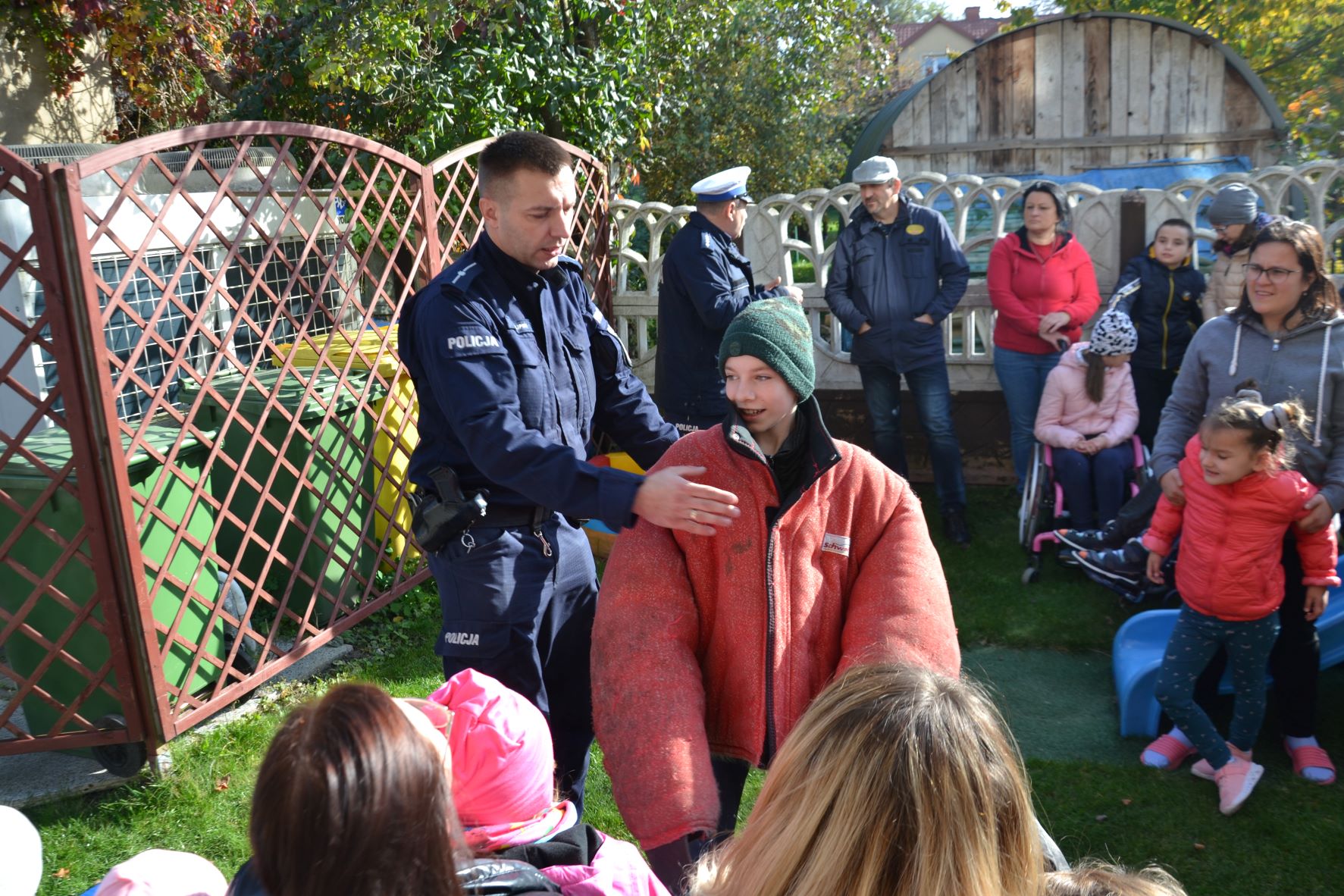 Największą atrakcją był pokaz umiejętności psa policyjnego. Wychowankowie dowiedzieli się w jaki sposób należy się zachować w przypadku spotkania z agresywnym zwierzęciem. Panowie zaprezentowali bezpieczne pozycje, które należy przyjąć w przypadku ataku ze strony psa. Chętni wychowankowie mieli możliwość zmierzenia odzieży ochronnej wykorzystywanej podczas tresury psa. Dużym zainteresowaniem cieszyła się również prezentacja wyposażenia policyjnego niezbędnego podczas wykonywania pracy oraz obejrzenia od środka radiowozu policyjnego.
